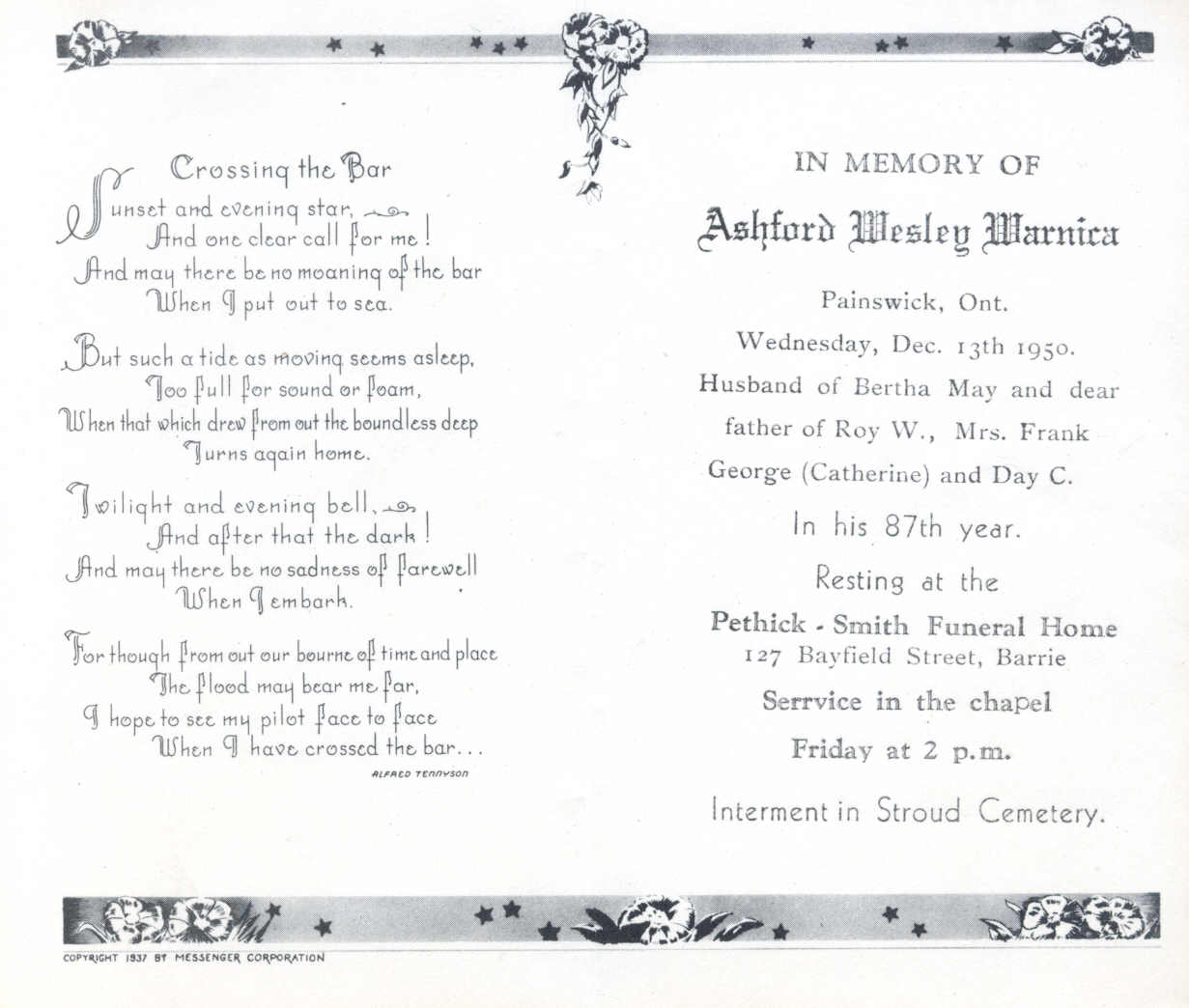 Copy of the funeral card for Ashford Wesley Warnica. The text includes a poem as well as the following information: "In Memory Of Ashford Wesley Warnica: Painswick, Ont. Wednesday, Dec. 13th 1950. Husband of Bertha May and dear father of Roy W., Mrs. Frank George (Catherine) and Day C. In his 87th year. Rest at the Pethick-Smith Funeral Home 127 Bayfield Street, Barrie. Service in the chapel Friday at 2 p.m. Interment in Stroud Cemetery."