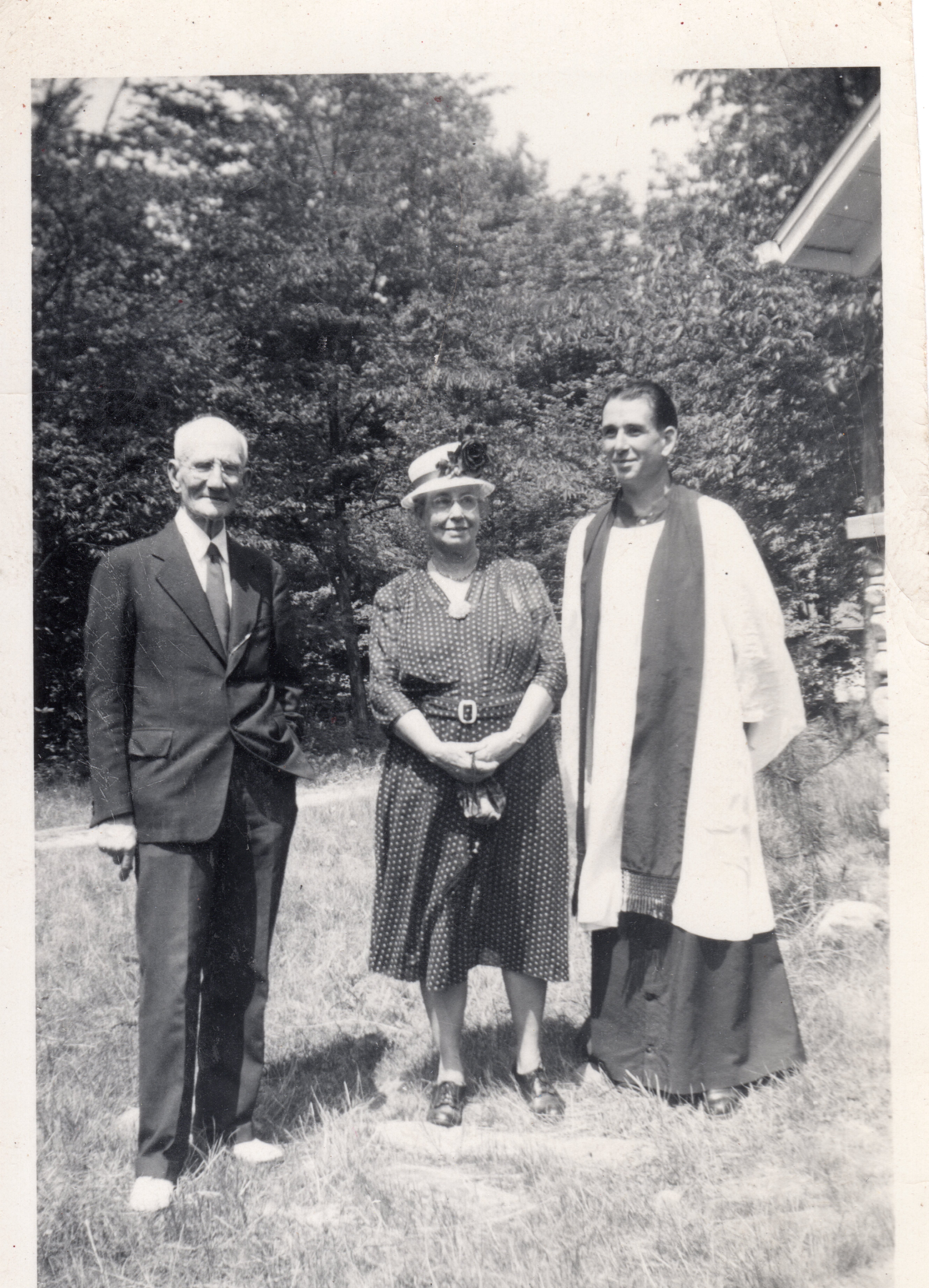 Photo of the minister presiding over the baptism of Bill Warnica, Reverend Jack William Newton-Smith (right) of St. Paul's Church, Innisfil, on 11 July 1948. Also pictured are Reverend Claude Percival Muirhead (left) of the Big Bay Point Church St. Andrew's By The Lake, and his wife Berthe (née Allwood) Muirhead.