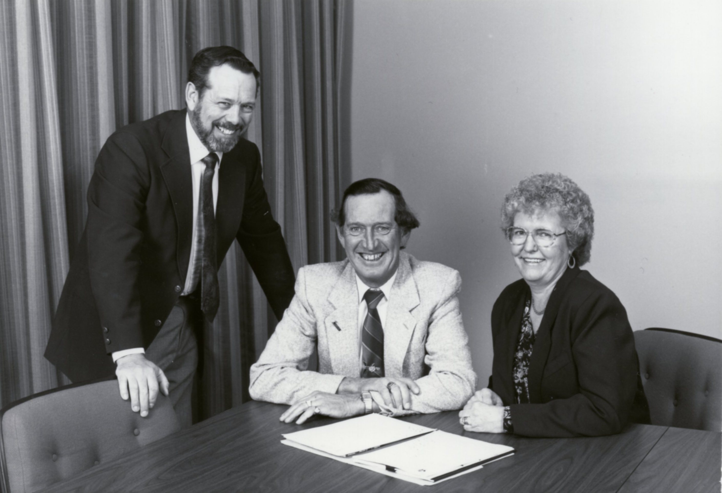 Three people sat at a meeting table in business attire, with a document on the table. (L-R) William (Bill) G Bell, Grant Andrede, Grace Welsh.