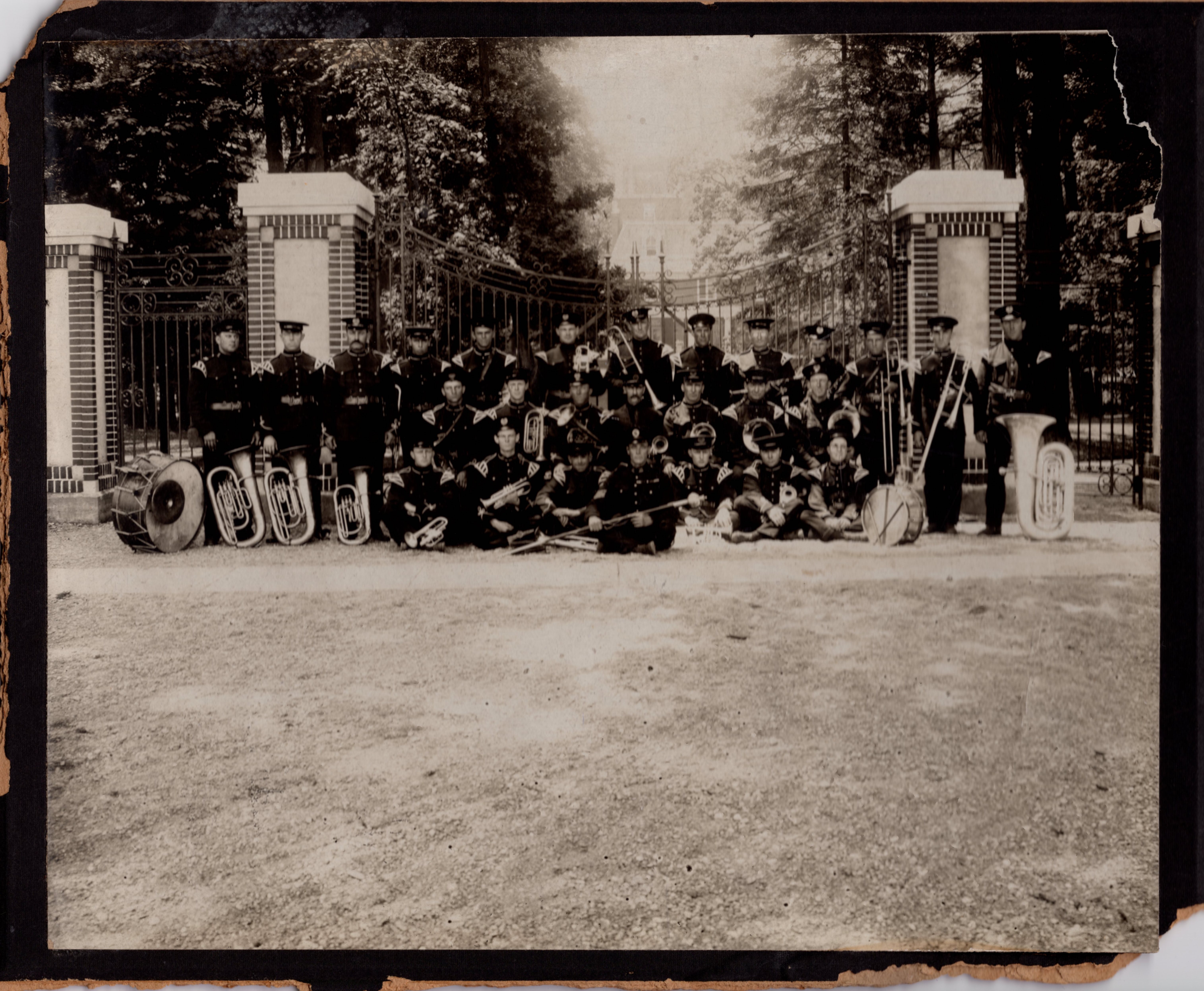 Photograph of the Thornton Band standing in front of gates after winning first prize at the Canadian National Exhibition. This photo includes [?] Grose (Trombone), Norman Wilson (Saxophone), Earl Wilson, Roy Beatty, Bob Gamble.