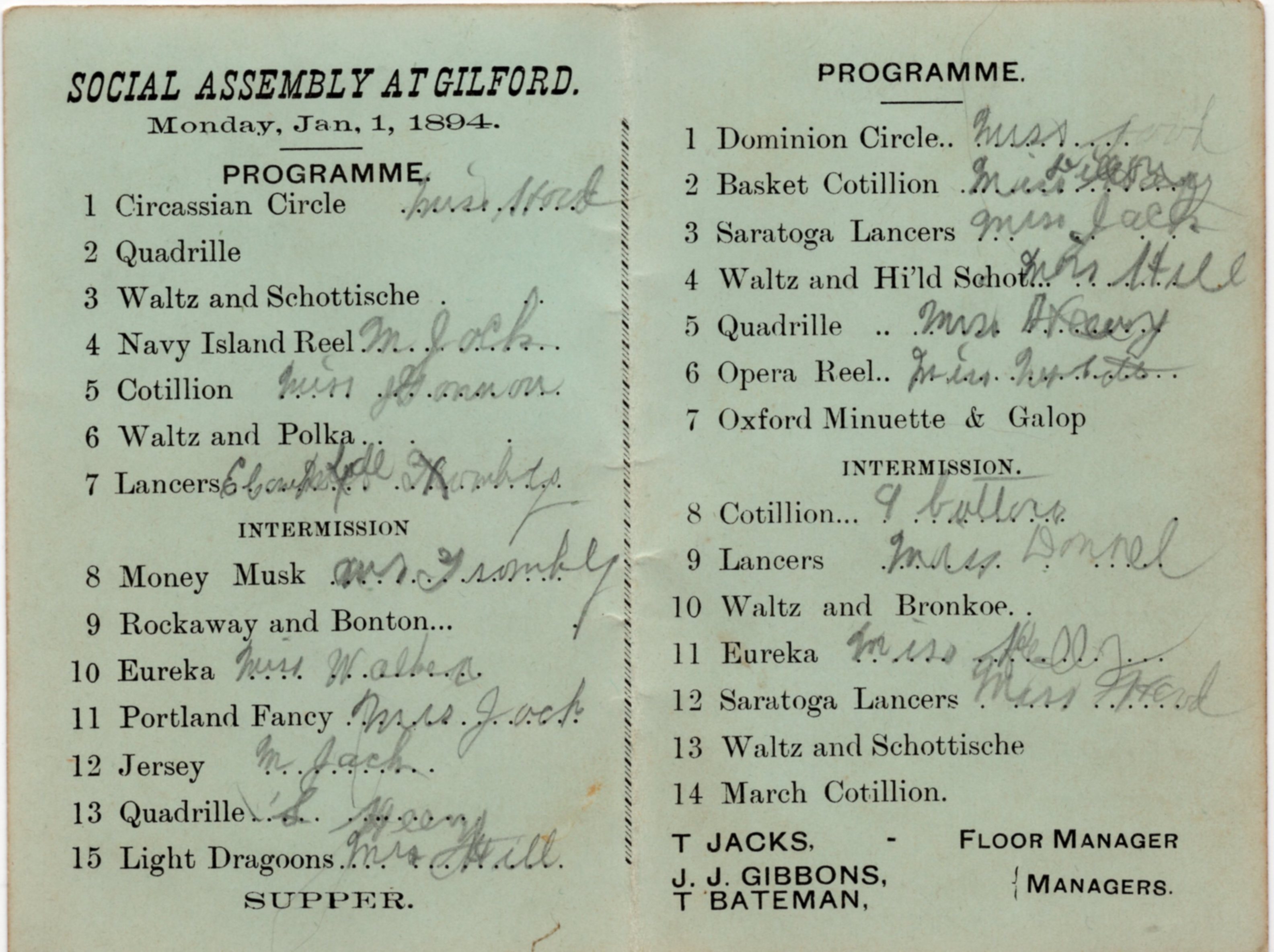 A programme outlining the Social Assembly at Gilford that took place Monday, Jan. 1St, 1984. The programme included seven dances, followed by an intermission, then seven more, followed by supper. The right side has the same order of events but a different combination of dances.