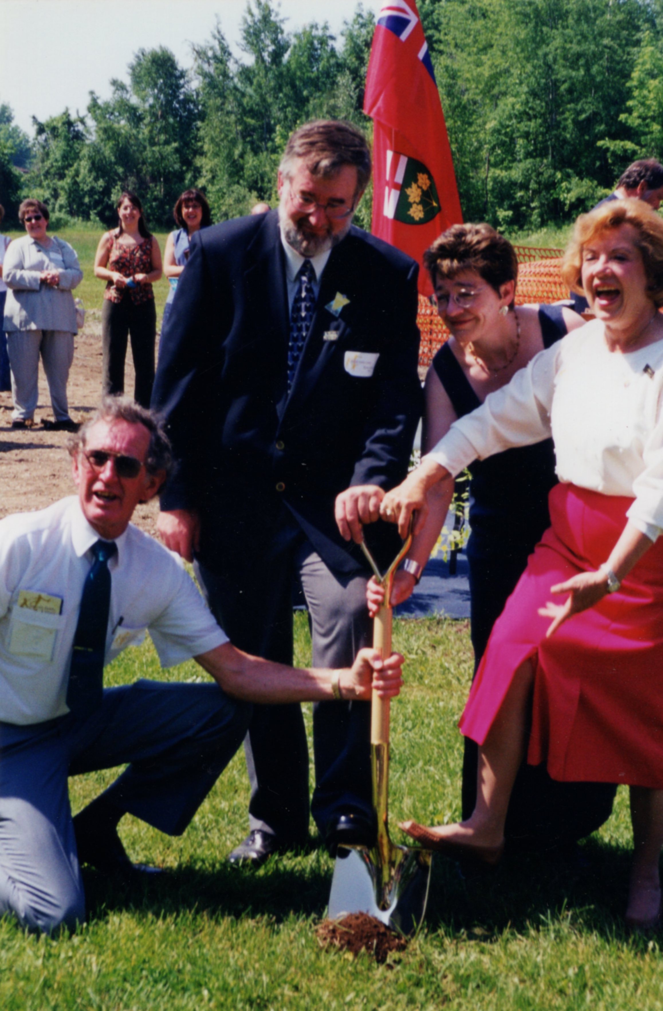 Photograph of the dirt removal by four people using a golden shovel at the official ground breaking ceremony of the Lakeshore branch for Innisfil Public Library. Pictured from left to right: Unknown, Mayor Brian Jackson, Susan Downs, and Margaret [?]. Photo taken on 10 June 2000.