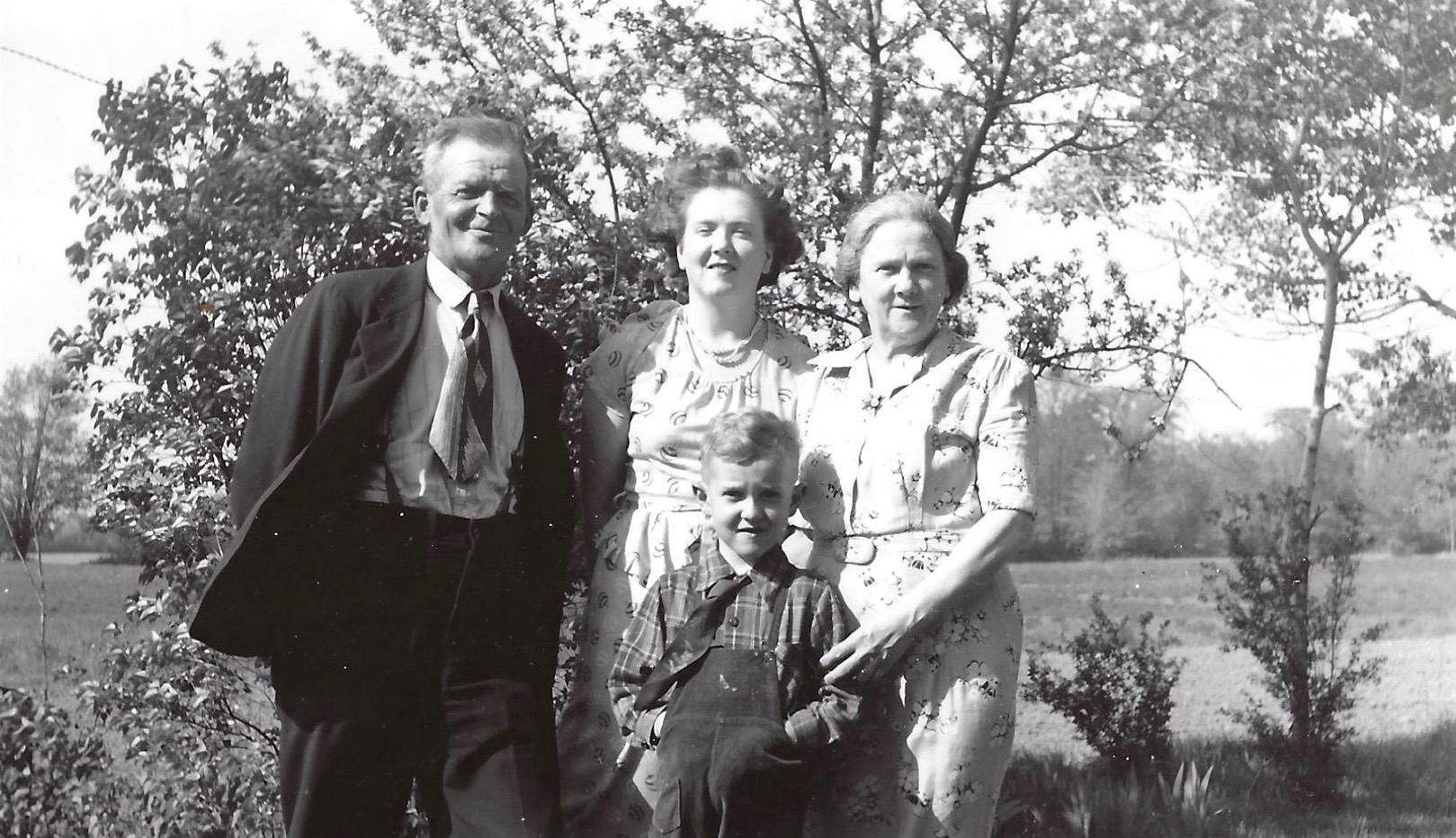 [L-R] Chalmer Pratt, Dorothy Pratt, Mary (Taylor) Pratt [Allie]. The child standing in front is Ivan Pratt. The family stands outdoors in a field, dressed in smart clothes, suspected to be attending an event.