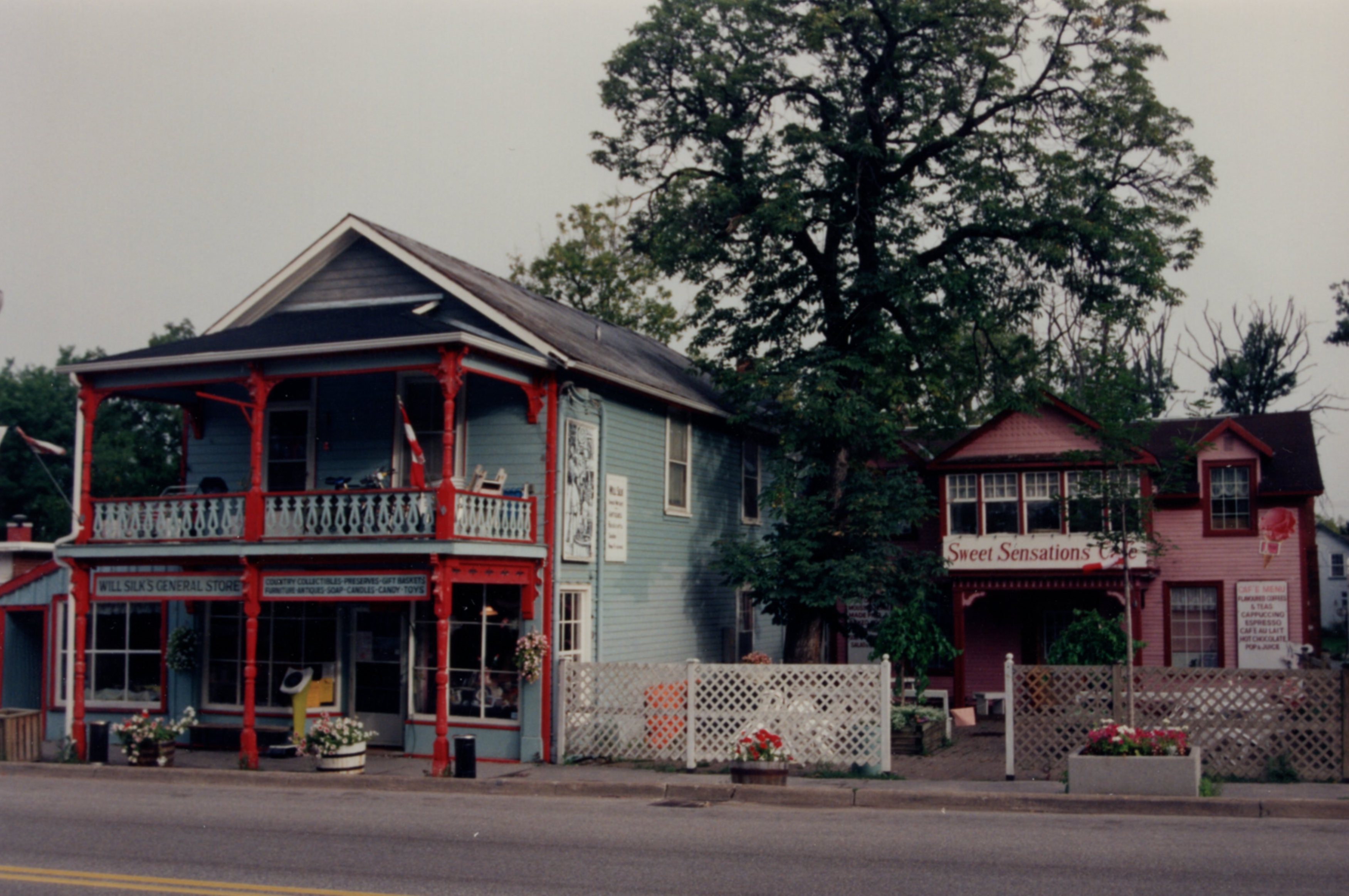 Photograph showing Will Silk's General Store painted blue with red beams. The house to the right is painted pink, it is an ice cream store called Sweet Sensations. Both houses are located on Main Street, in Cookstown.