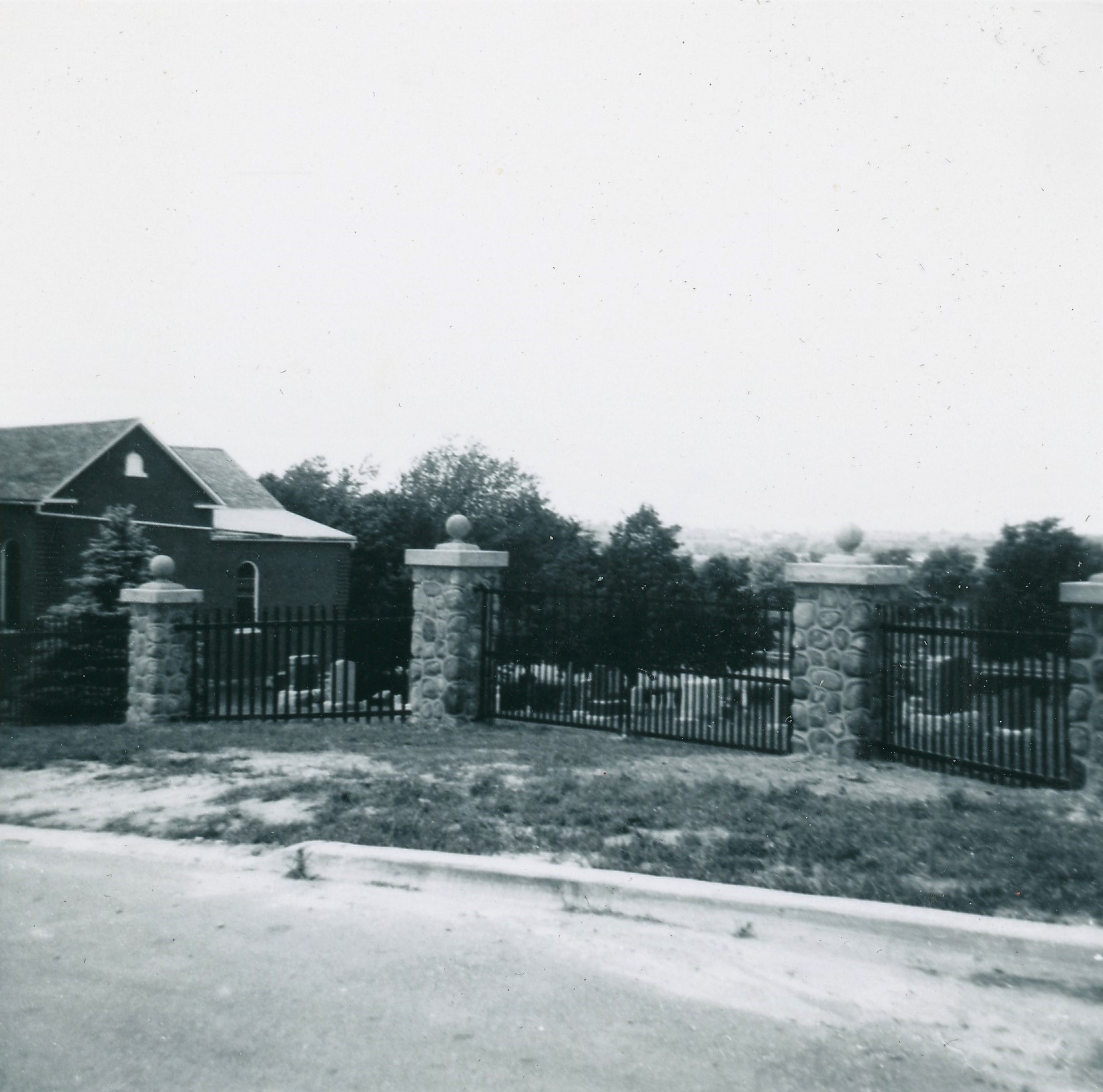 View of wrought iron fencing and stone pillars around the St. John's Anglican Church cemetery in Cookstown.