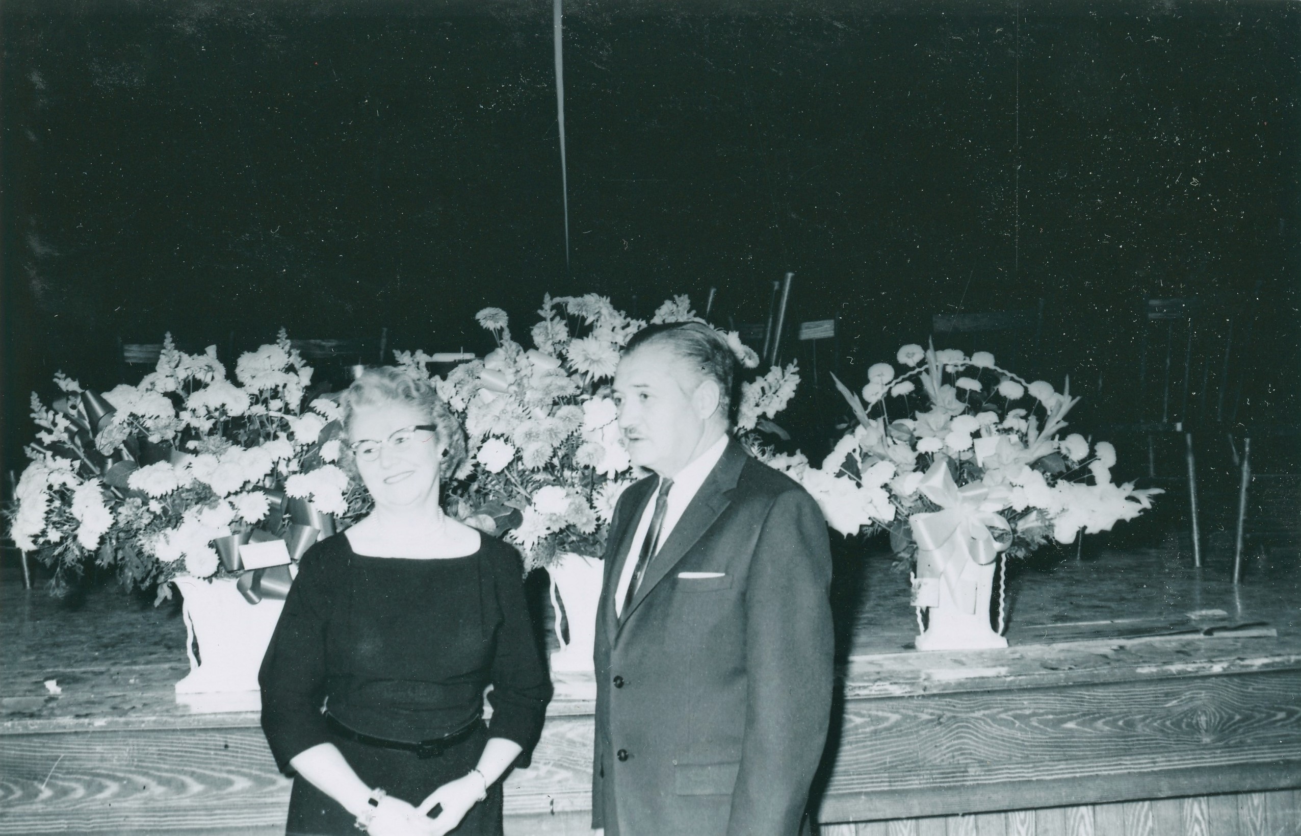 Portrait of Mr. and Mrs. Ira Wilson standing in front of bouquets of flowers on a stage in 1962. Ira Wilson was the first Reeve of Cookstown when it was incorporated as a village in 1962.