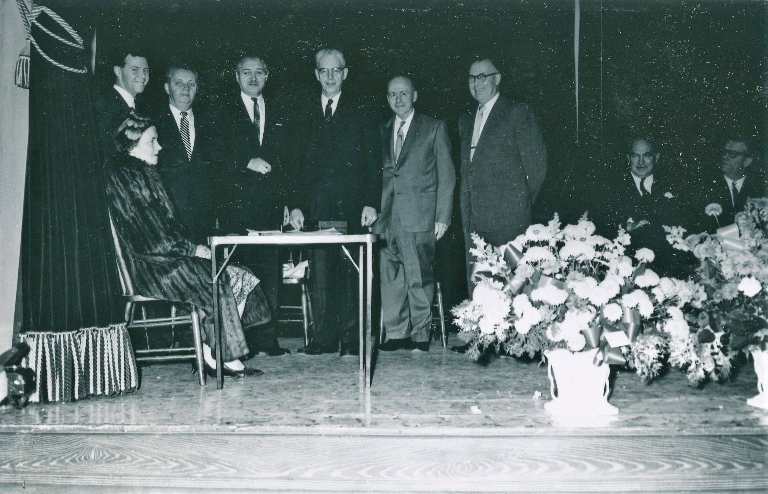 Photo taken during the ceremony recognizing that Cookstown had been incorporated as a Village in 1962. The photo shows a woman, Mrs. R. Cauldwell, seated at the side of a table with a group of men posing behind the table. From left to right they are: Councillor Jack Edney, Councillor Norman Baker, Reeve Ira Wilson, an unidentified man, Councillor Lewis Monkman, and Councillor Eldon Neilly.