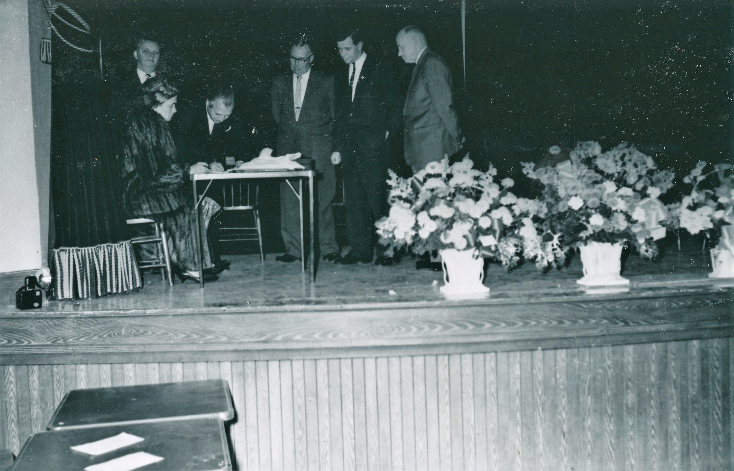 Photo taken during the ceremony recognizing the incorporation of Cookstown as a Village in 1962. The photo shows a woman, Mrs. R. Cauldwell, seated at the side of a table with Reeve Ira Wilson signing a document at the table. To the left of him is Councillor Norman Broley, and to the right are Councillors Eldon Neilly, Jack Edney, and Lewis Monkman.