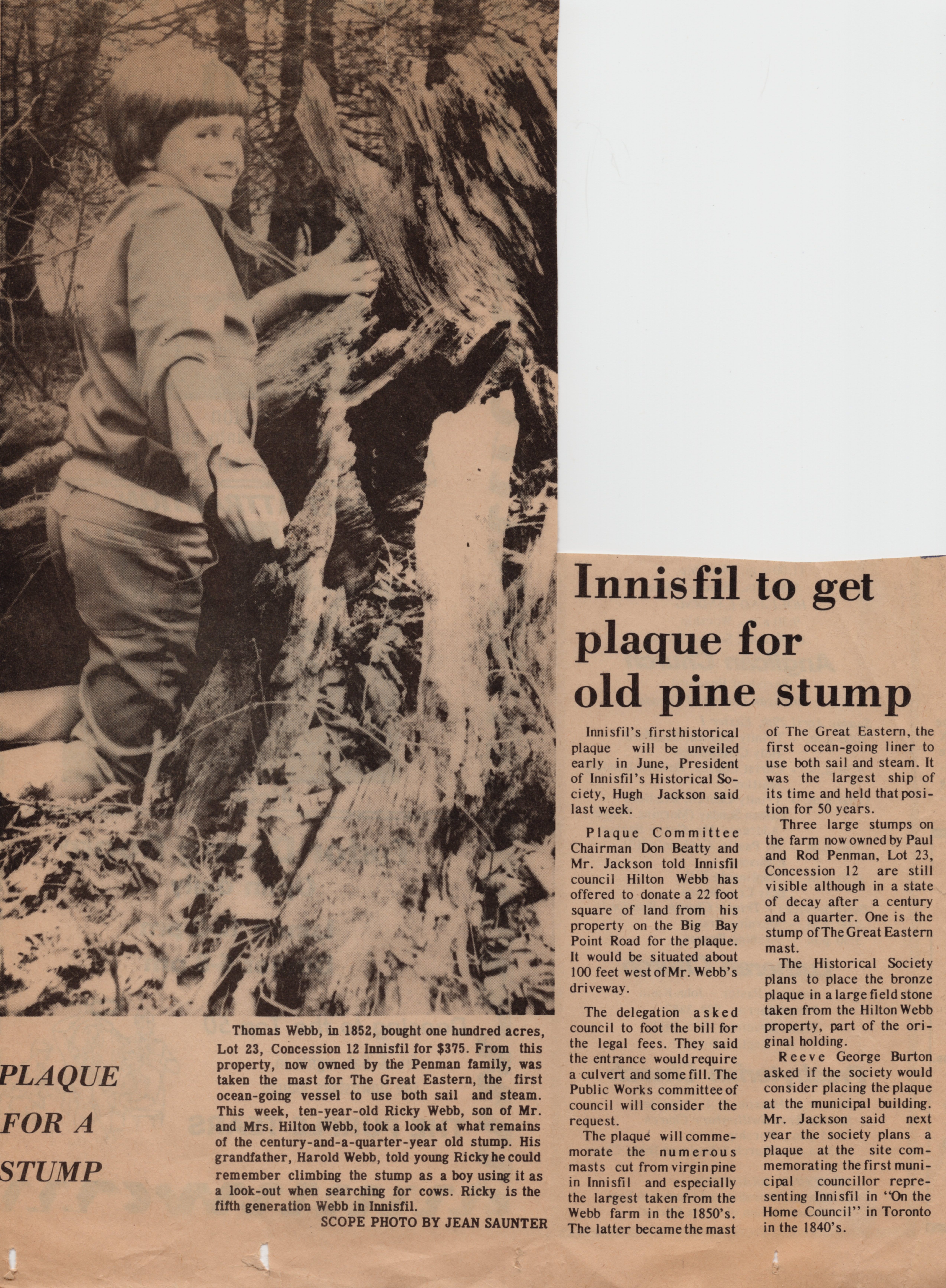 Newspaper article with an accompanying image. Caption under the image reads: "Thomas Webb, in 1852, brought one hundred acres, Lot 23, Concession 12 Innisfil for $375. From this property, now owned by the Penman family, was taken the mast for The Great Eastern, the first ocean-going vessel to use both sail and steam. This week, ten-year-old Ricky Webb, son of Mr. and Mrs. Hilton Webb, took a look at what remians of the century-and-a-quarter-year old stump. His grandfather, Harold Webb, told young Ricky he could remember climbing the stump as a boy using it as a look-out when searching for cows. Ricky is the fifth generation Webb in Innisfil. SCOPE PHOTO BY JEAN SAUNTER"