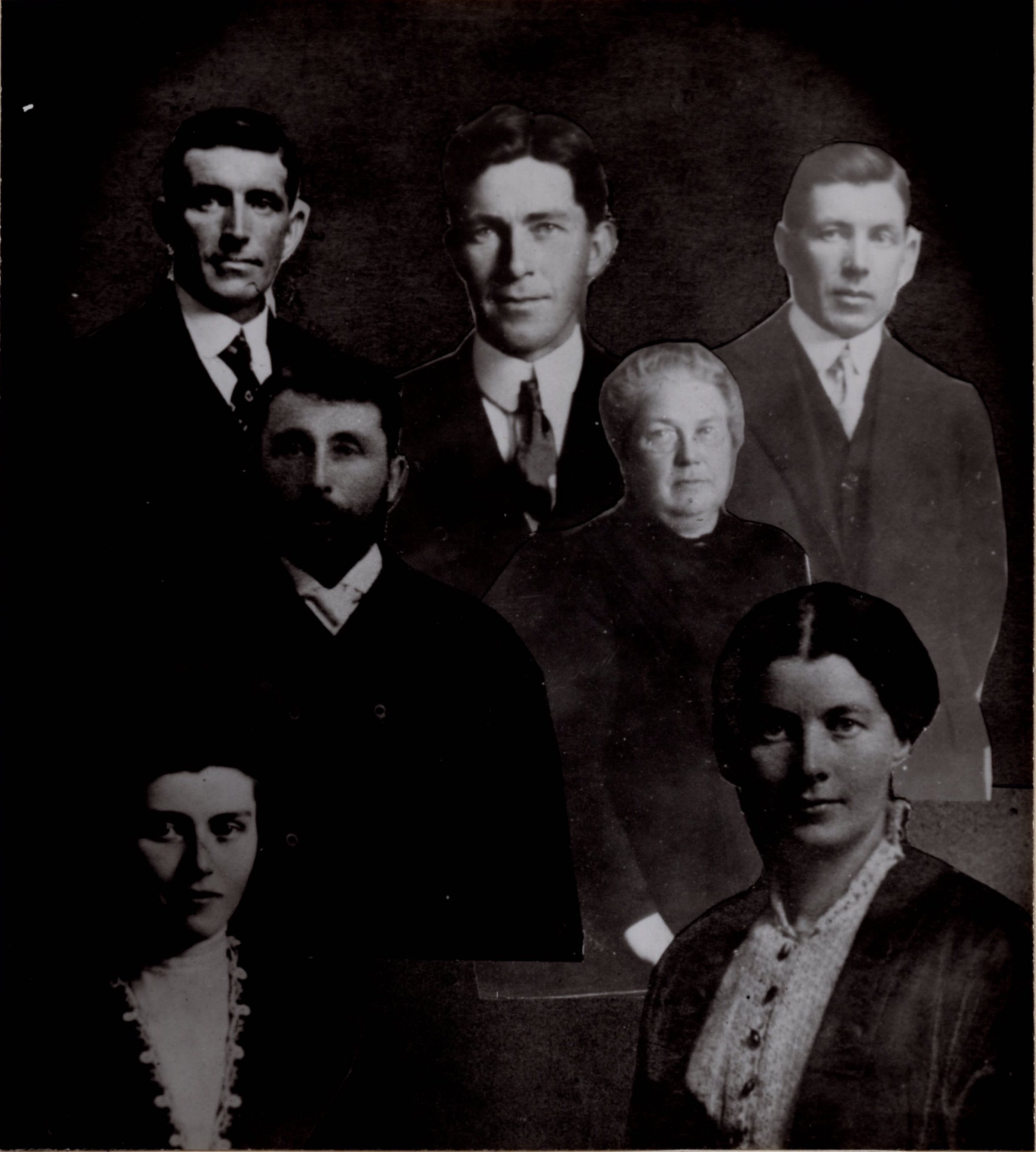 A black and white photographed collage of the Robrt J. Stewart Family. Back Row, left to right: Harry, Wilfred, Charlie. Centre: R. J. and Mrs. Stewart. Front Row, left to right: Millie and Mabel.