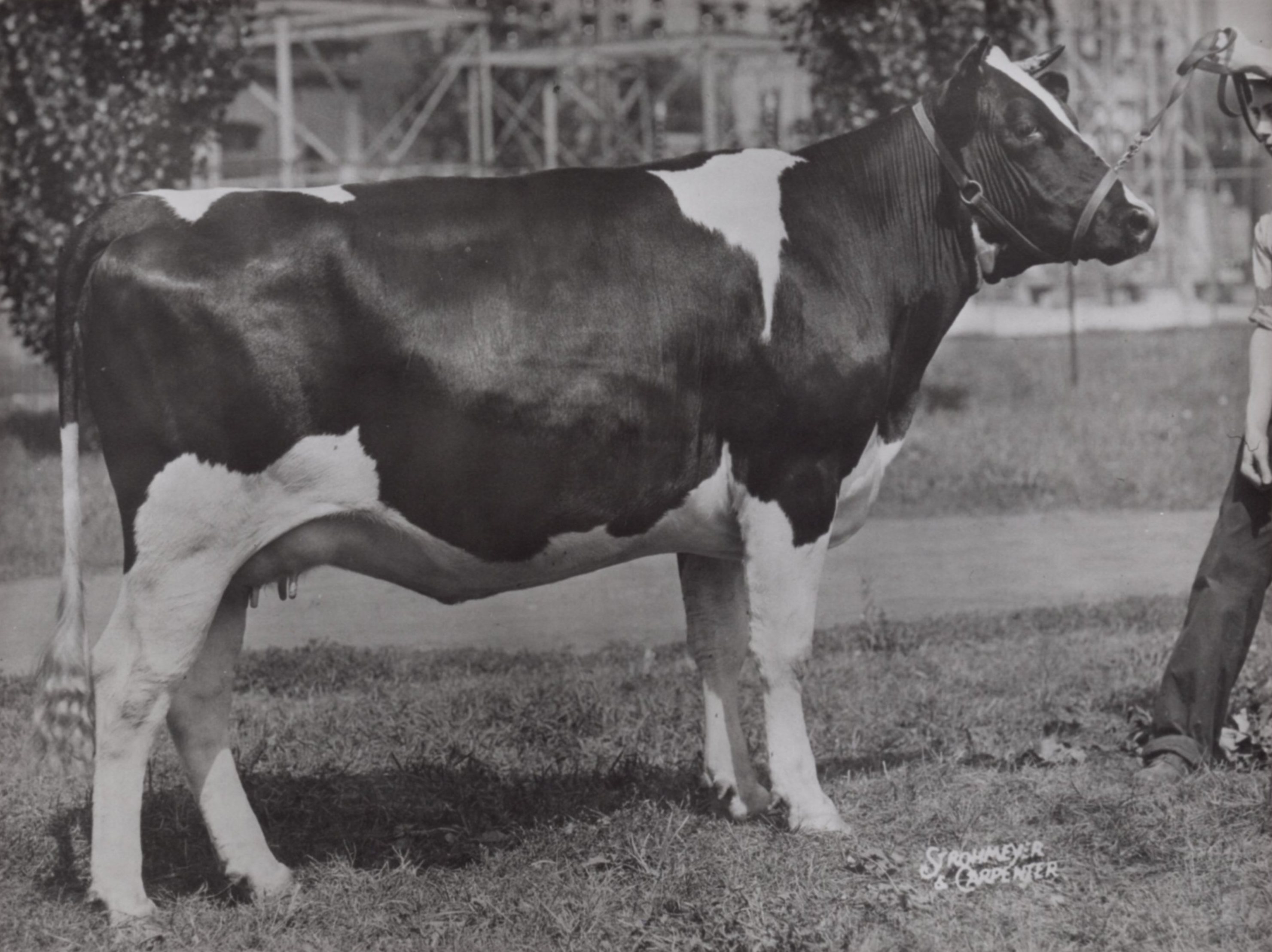 Image taken from 'The History of Two Pioneer Families and The Farm at S.H. Lot 19, Con. 5. Innisfil Township, Simcoe County'. The 1939 Senior Yearling All American Heifer. AAGGIE PLUTO SEGIS 386816 CHB. Sire: Sir Pluto Jasmine 104592 CHB. Dam: Aaggie Jewel Segid 330080 CHB. Breeder: H. M. Stewart, Lefroy, Ontario, Canada. 1939 Show Record: First Prize Senior Yearling, Junior and Reserve Grand Champion at the Canadian National Exhibition.