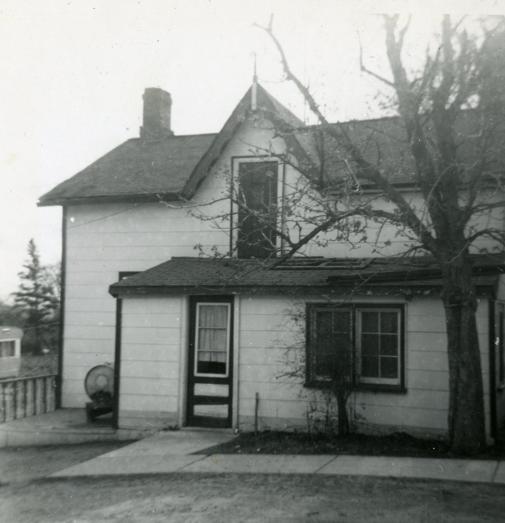 Photo of a white clapboard, two-storey house with dormer and front entrance enclosure