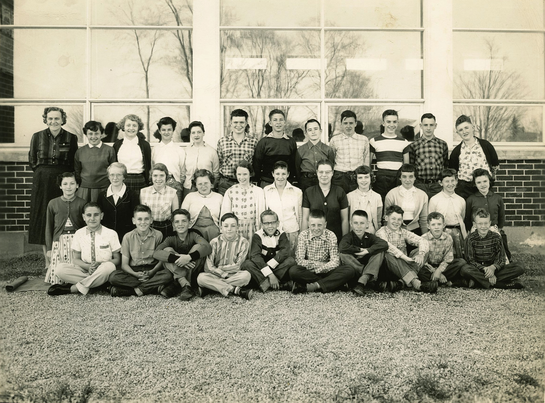 Photo of the Senior Room of Painswick School for the year 1956-57 with teacher Mrs. Shannon. Pictured from left to right, back row: Mrs. Shannon, Lorna Cromarty (grade 8), Valerie Westman (grade 8), Susan Finnis (grade 7), Katherine Borneman (grade 7), Bob Belshaw (grade 6), Bob Chapman (grade 7), Richard Small (grade 7), Bob MacDonald (grade 8), Ewan Sheard (grade 6), Kenneth Borneman (grade 7), and Jack Bayliss (grade 6). Middle row: Marilyn Riddell (grade 6), Luella Nesbitt (grade 6), Leona Belshaw (grade 6), Carol Jeffels (grade 6), Nancy Stark (grade 6), Betty Chapman (grade 6), Betty Belshaw (grade 6), Joan McKenney (grade 6), Joan Atkinson (grade 6), Diane Batters (grade 7), and Cecilia Reynolds (grade 8). Front row: Ronnie Batters (grade 7), Elwood Atkinson (grade 7), Joe Rowe (grade 7), Gregory Wills (grade 6), Danny Webb (grade 7), Anthony Knowles (grade 8), Peter Sisler (grade 8), Bill Jeffels (grade 6), Kenneth McKeown (grade 6) and David Thorne (grade 6). Photo and names were provided to Bill Warnica by Valerie Francis (formerly Valerie Westman).