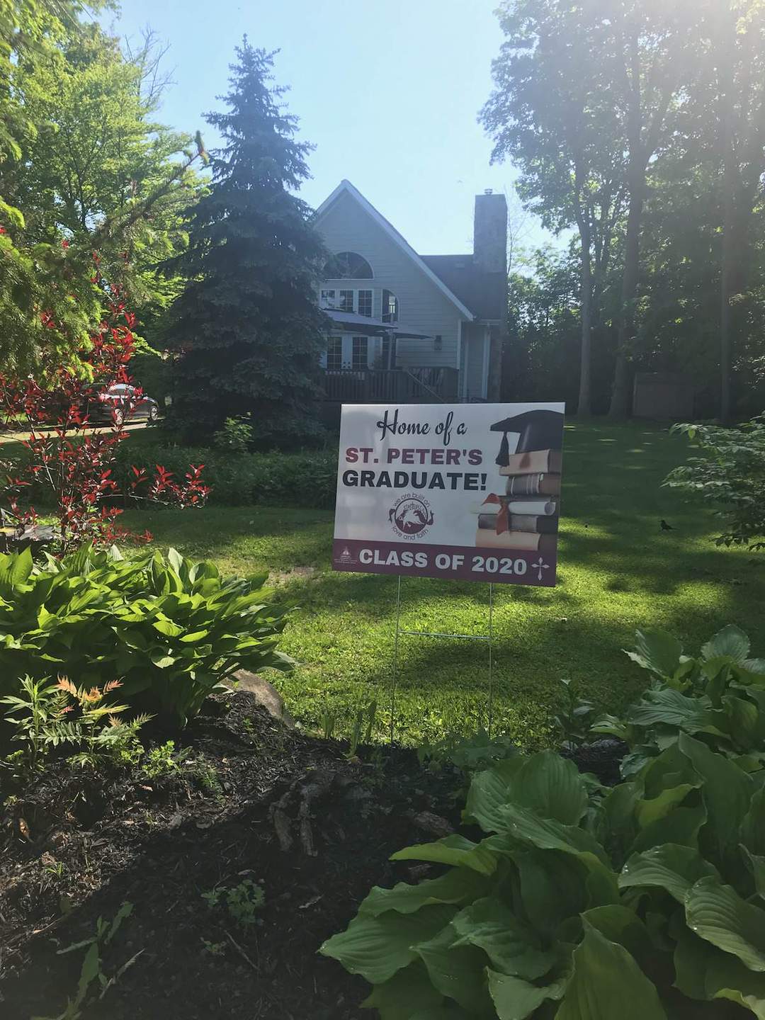 Photo taken by Shannon Kelly-Robb in Big Bay Point of a sign placed by St. Peter's Catholic Secondary School announcing "Home of a St. Peter's Graduate! Class of 2020" to help celebrate the graduation of a number of students who are unable to participate in traditional graduation ceremonies and traditions due to Covid-19 restrictions. Photo taken and submitted on 5 June 2020.