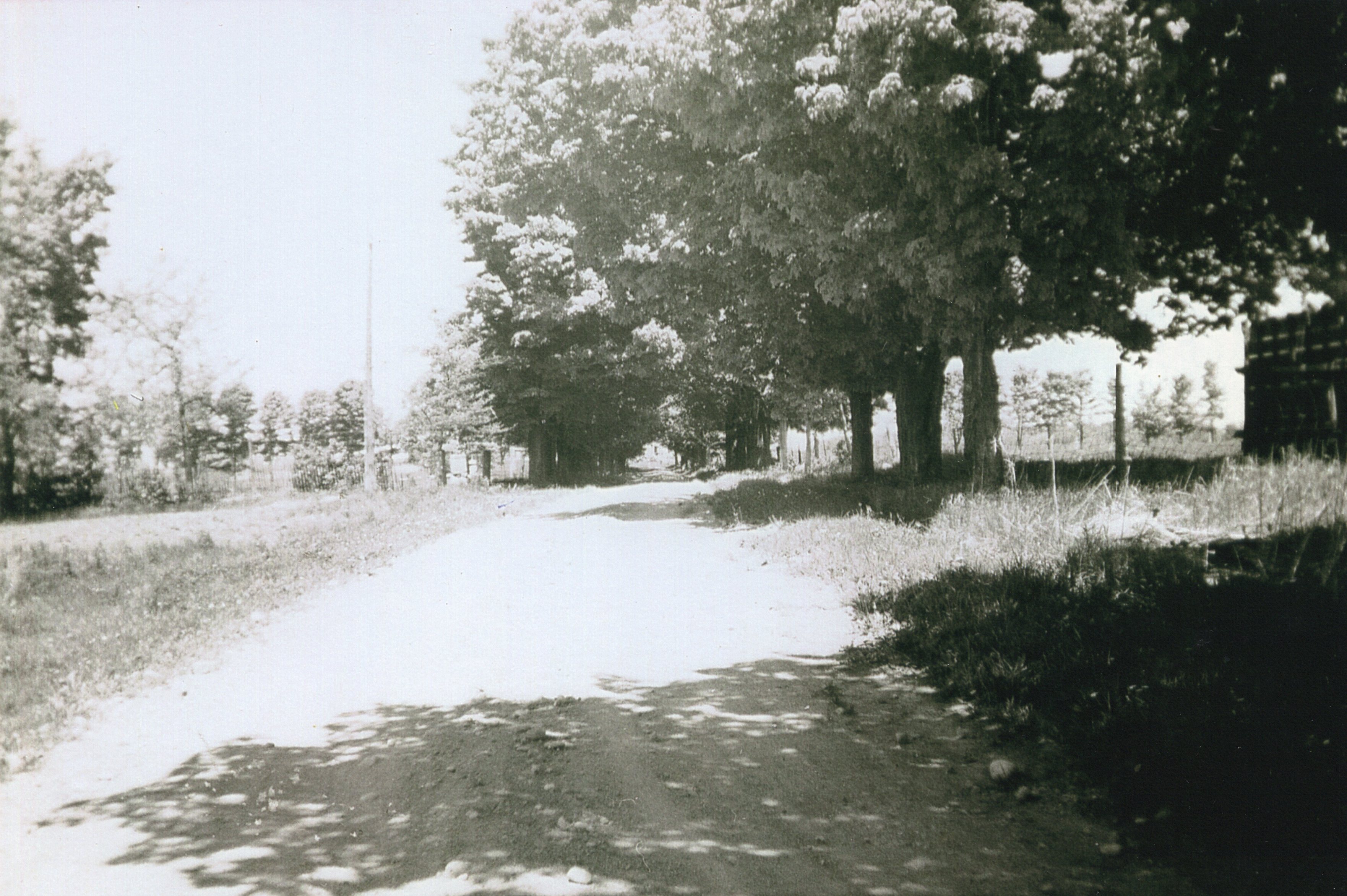 Black and white photograph donated by Yvonne Kemp showing the maple trees lining the lane of the Greensides McMaster Farm on Concession 4 of Innisfil. This photo was taken looking down the lane.