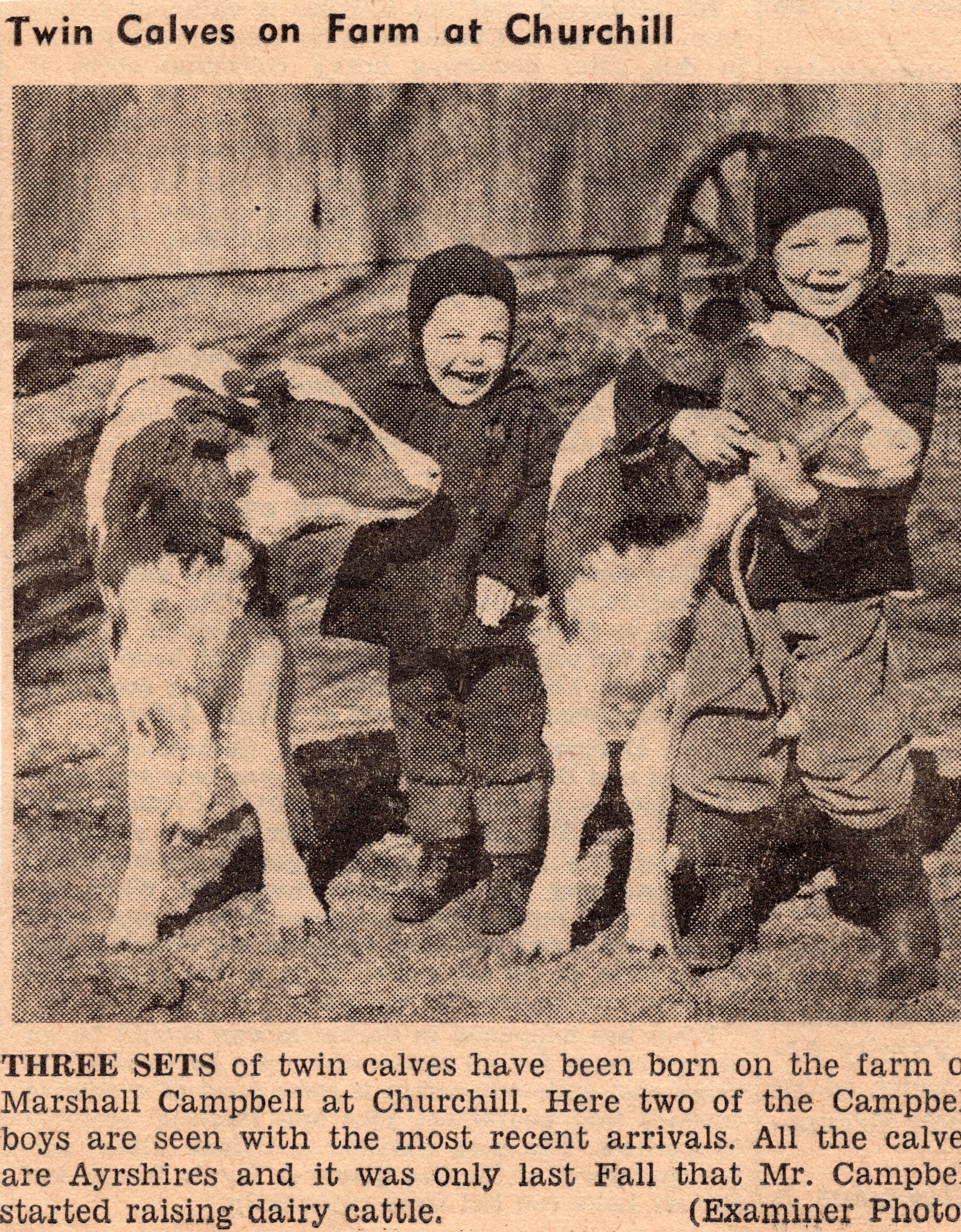 Newspaper clipping of a photo of two young children embracing twin calves with the following caption: "Three sets of twin calves have been born on the farm of Marshall Campbell at Churchill. Here two of the Campbell boys are seen with the most recent arrivals. All the calves are Ayreshires and it was only last Fall that Mr. Campbell started raising dairy cattle. (Examiner Photo)" The clipping likely came from the Barrie Examiner, though the date has not been included.