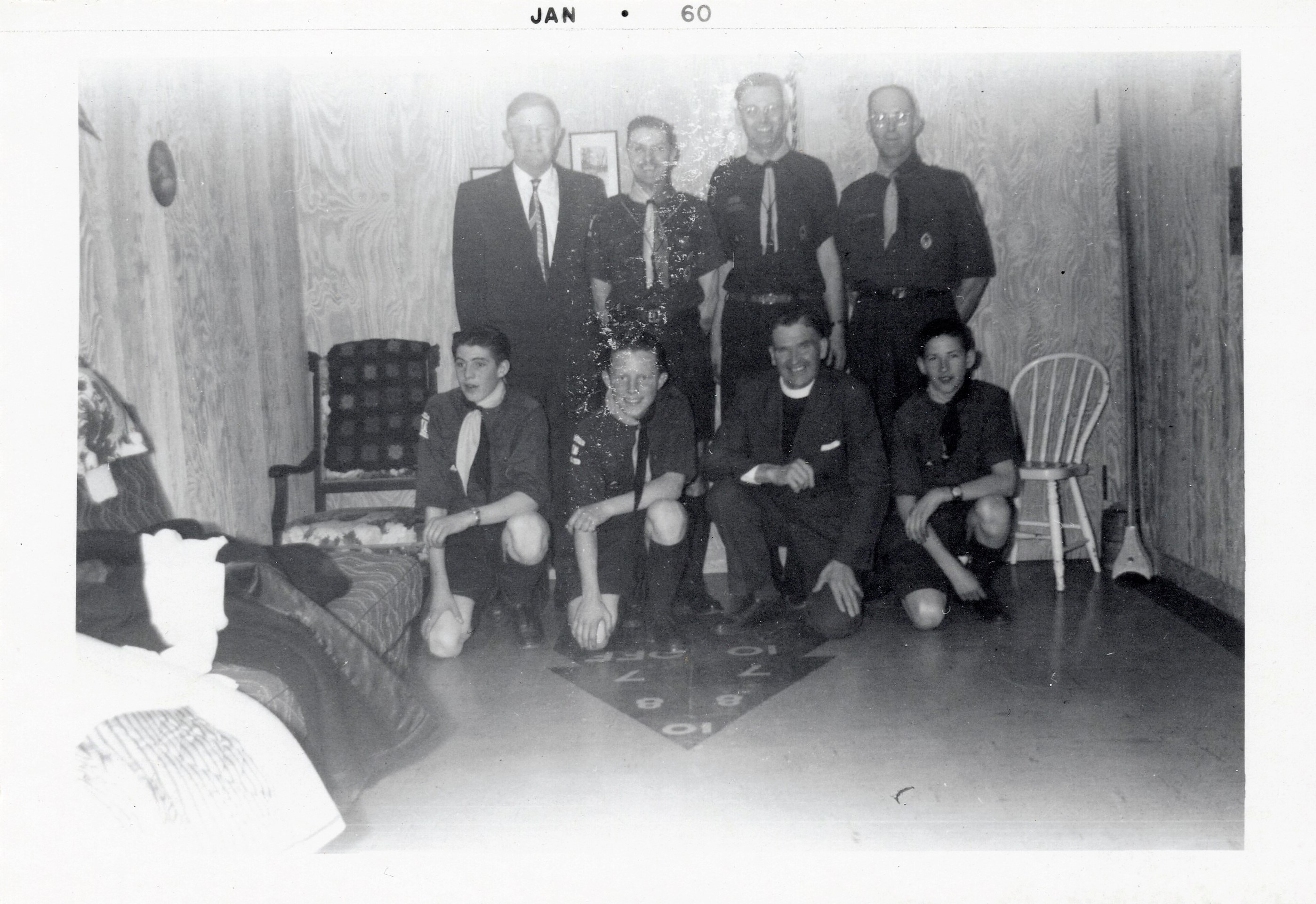 Photo of the Rover Crew of the Boy Scouts from circa 1958-59. Rovers were the highest rank of the Boy Scout movement, aged approximately 18 to 19. According to donor Lawrence Cumming, those pictured from left to right, front row: Paul Campbell, Glen Harris, Rev. Gordon Wanless, and either Wayne or Clayton Ayres. Back row: Elmer Pratt, Scouter Wilf Cooper, unnamed District Commissioner, and Rover Leader Gordon Mason.