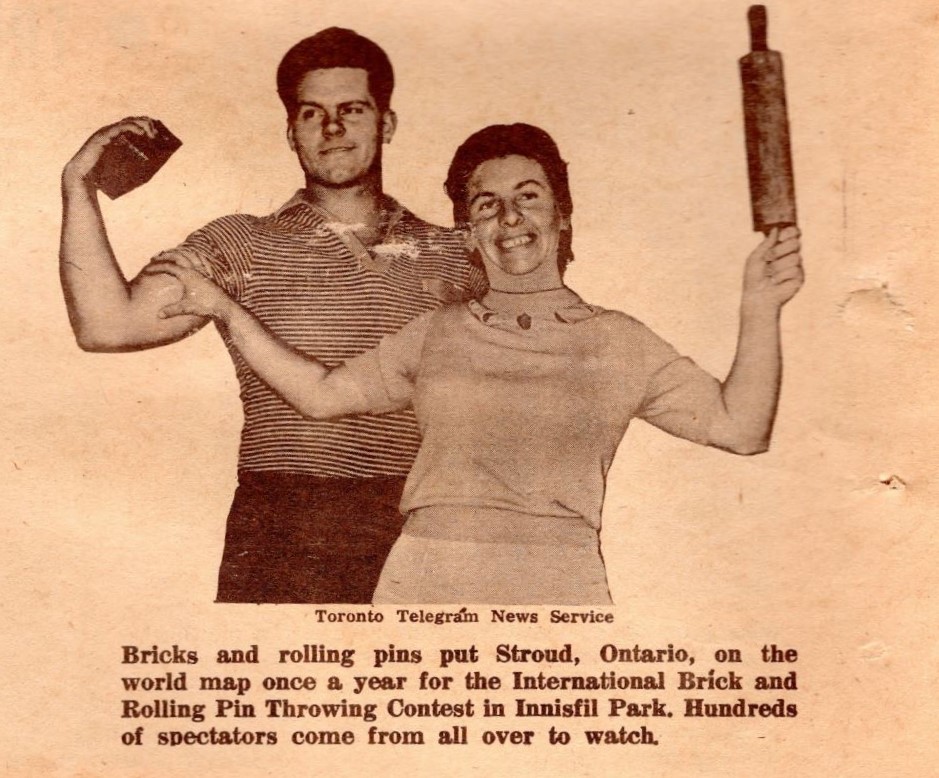 Photo of Bev Cochrane, champion brick thrower, and an unidentified woman, champion rolling pin thrower, from the International Brick and Rolling Pin Throwing Competition held in Innisfil Park. The image was captured in an oversized, newspaper-like promotional guide called Adventures in Huronia featuring tourist highlights from throughout Simcoe County. The caption reads: "Bricks and rolling pins put Stroud, Ontario, on the world map once a year for the International Brick and Rolling Pin Throwing Contest in Innisfil Park. Hundreds of spectators come from all over to watch." The competition was held annually between four towns named Stroud in the United Kingdom, Australia, United States, and Canada.