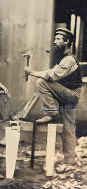 Undated photo of James Baron Cooke holding a hammer with a pipe in his mouth and one foot braced on a board with various carpentry tools around him. He's also wearing a checkered shirt, vest, workpants, and cap. James and his family had moved from Barrie to Innisfil in approximately 1877 and settled on a farm at Big Bay Point on lot 30, concession 14. The farm today exists as the Big Bay Point golf course as well as a strip of waterfront that had been converted into cottage waterfront lots. Photo donated to Bill Warnica by Nanci Patten, the second great-granddaughter of James Baron Cooke and his wife Mary Alice Booth.