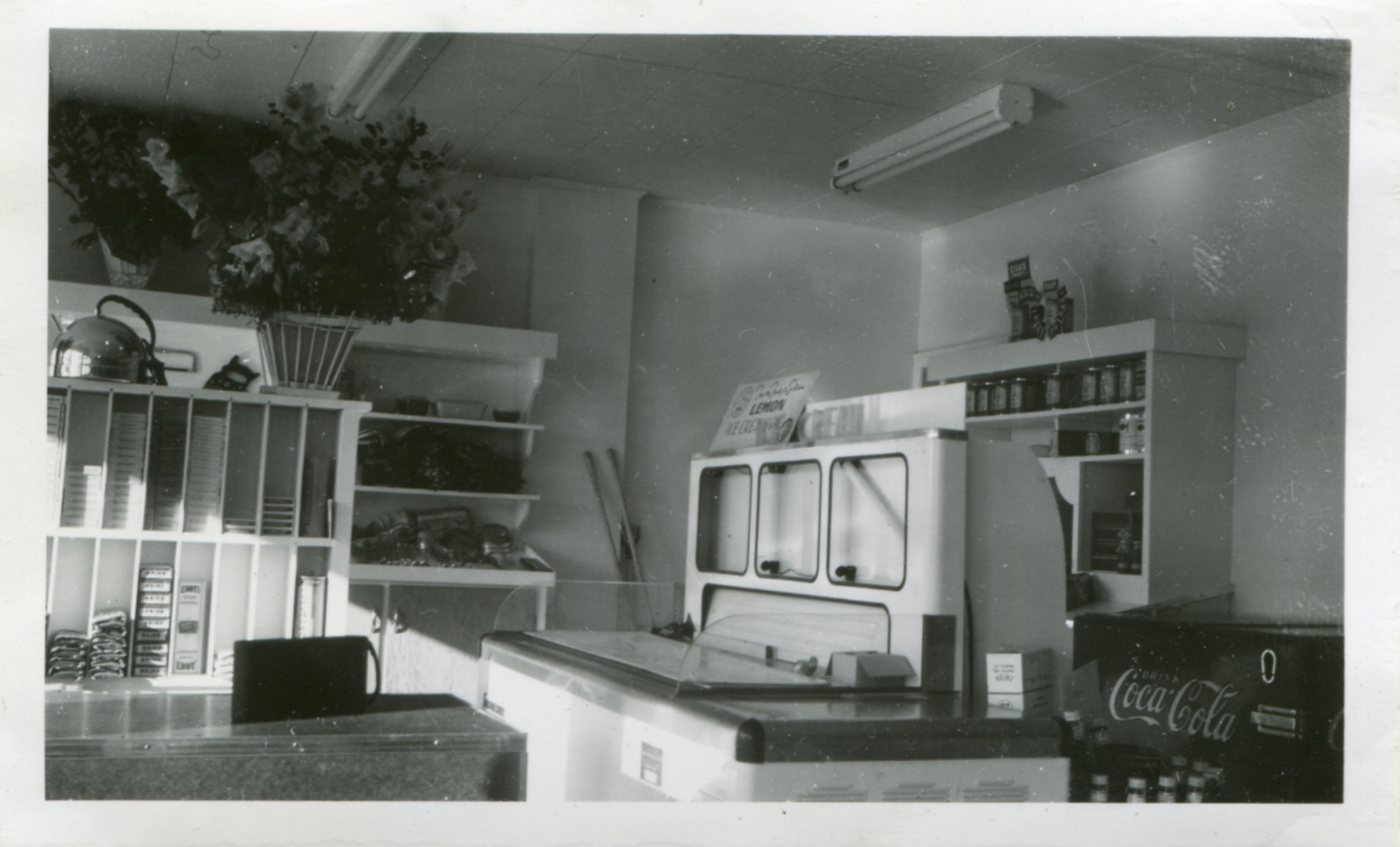 Photo taken inside Young's Store in Stroud just after opening in October 1950. The image shows two counters, various shelves against the wall, and a Coca-Cola display.