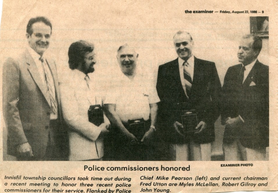 Newspaper clipping from the Examiner dated to Friday 22 August 1986 featuring a photo of police commissioners being honoured. The photo's caption reads: "Innisfil township councillors took time out of a recent meeting to honor three recent police commissioners for their service. Flanked by Police Chief Mike Pearson (left) and current chairman Fred Utton are Myles McLellan, Robert Gilroy, and John Young."
