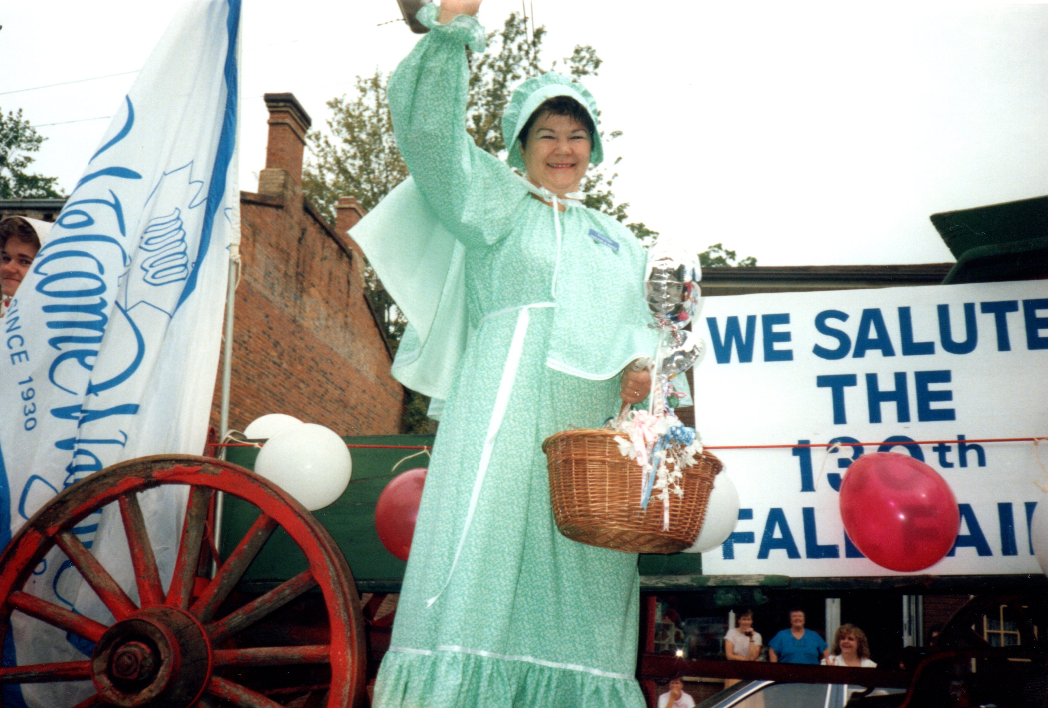 Image of a woman standing on a float during a parade on Queen Street in Cookstown. She wears a mint green dress and bonnet, is holding a weaved basket, and is waving to the spectators A sign on the float behind her reads "We Salute the 130th Fall Fair".