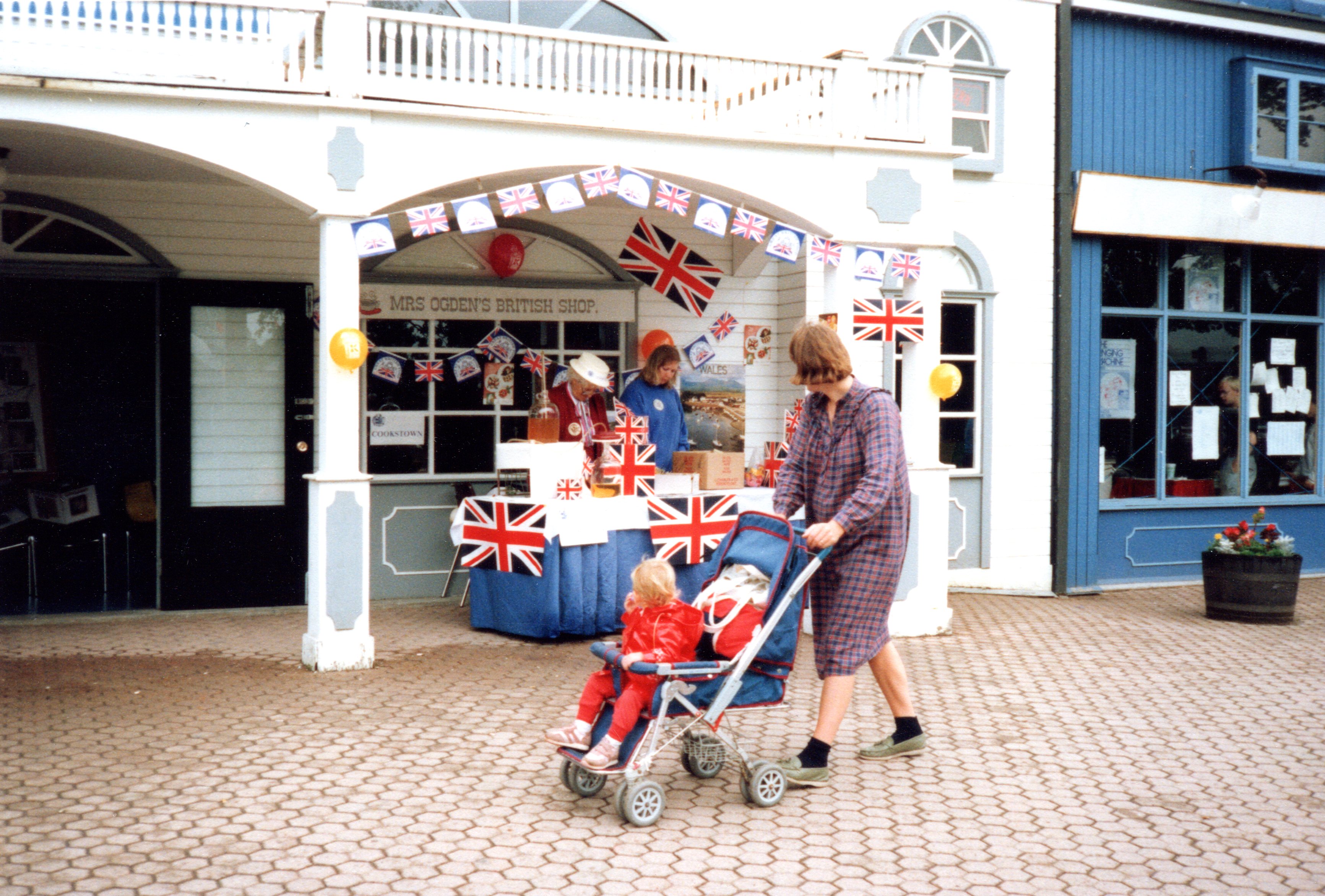 Image of Mrs. Ogden's British Shop in Cookstown with a display table outside. The display consists of Union Jacks attached to the table, Union Jack bunting, balloons, and a poster of Wales. A mother is pushing a pram in front of the stall, as she and the child sitting in the pram look back at the display.