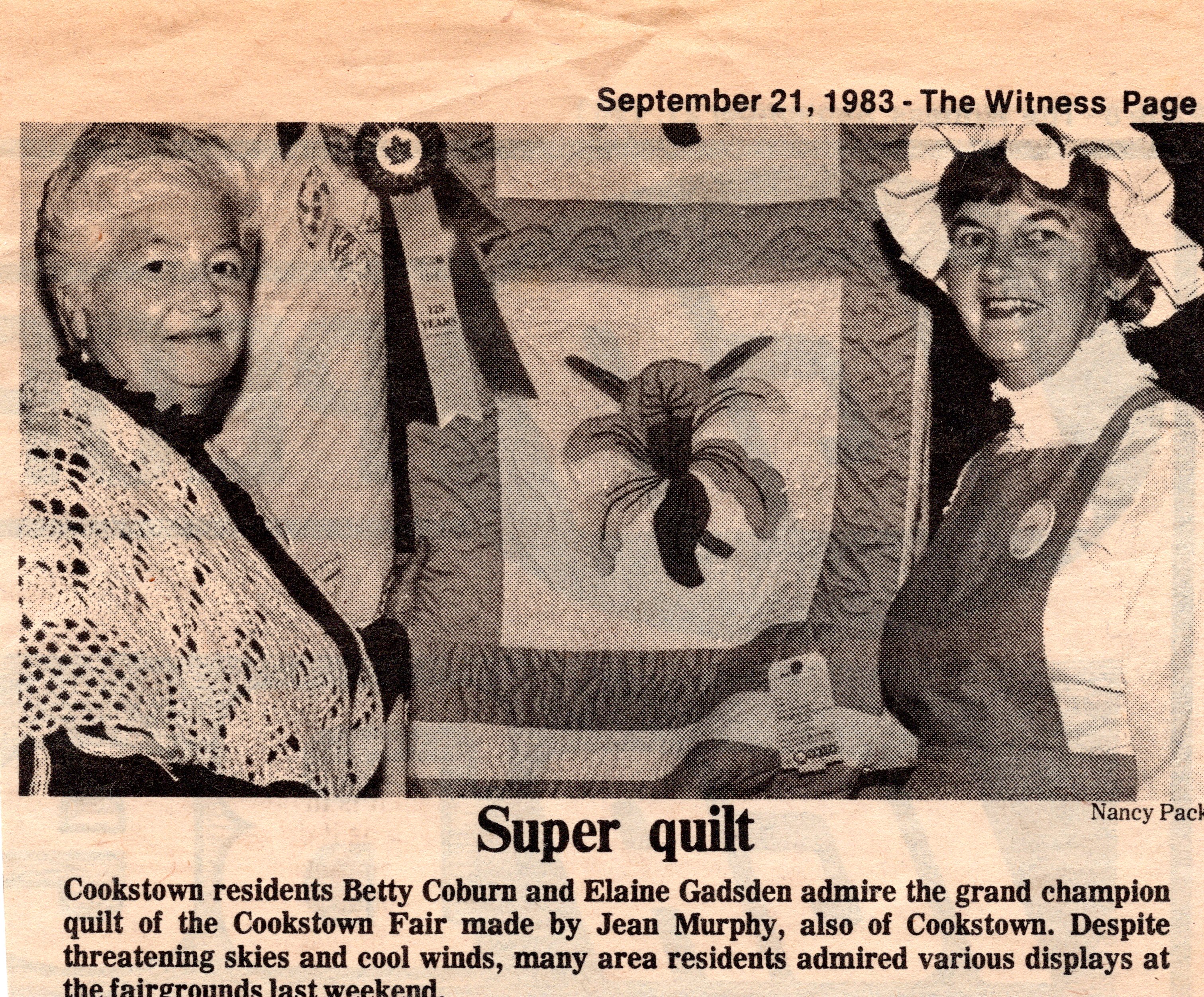 A newspaper clipping of two women standing in front of a quilt with the caption: "Super quilt: Cookstown residents Betty Coburn and Elaine Gadsen admire the grand champion quilt of the Cookstown Fair made by Jean Murphy, also of Cookstown. Despite threatening skies and cool winds, many area residents admired various displays at the fairgrounds last weekend." Photo by Nancy Pack. Appeared in the 21 September 1983 issue of The Witness.