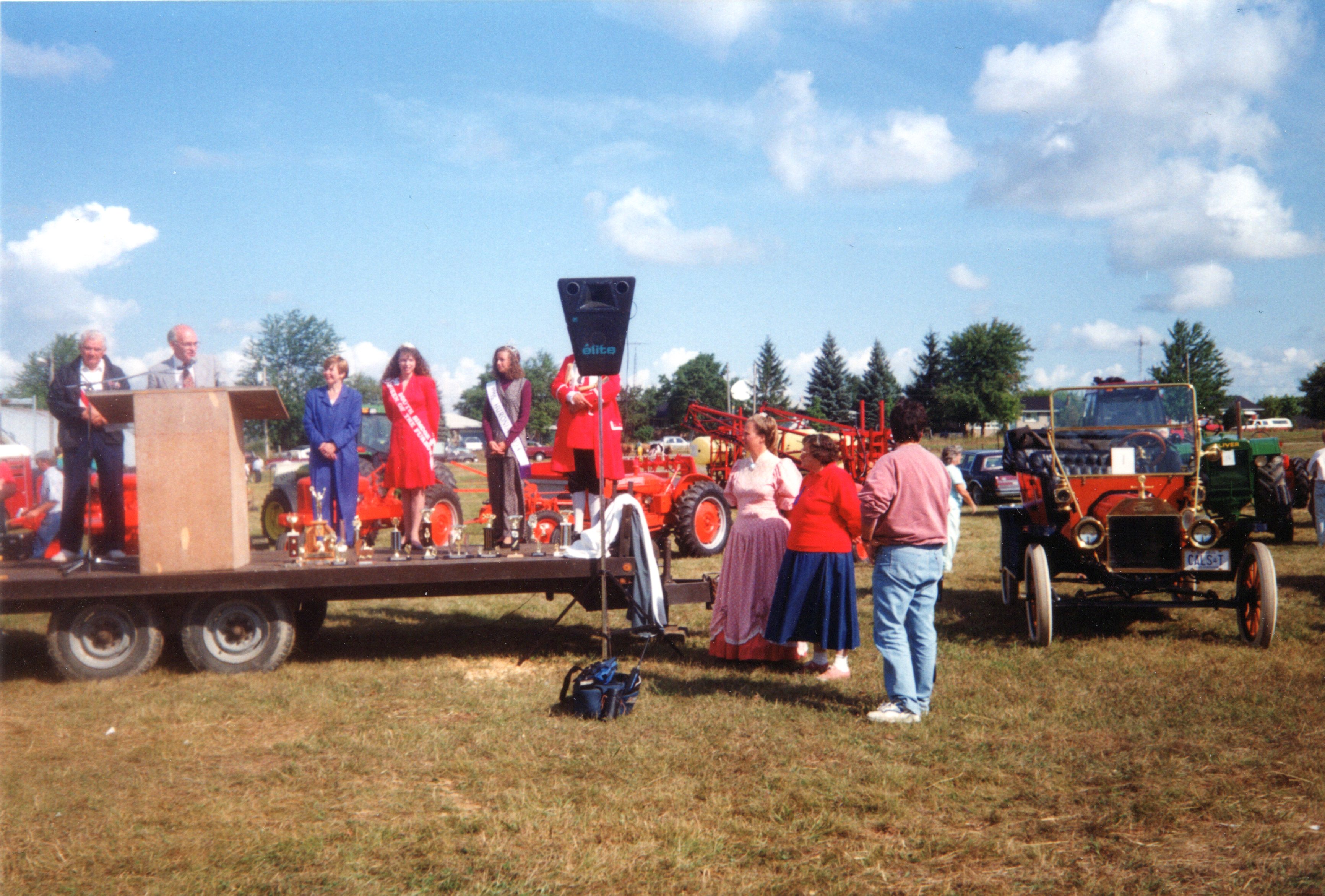 Image taken on Cookstown Agricultural Fairgrounds during an event. Pictured are a trailer stage, tractors, a vintage car, and people participating in a ceremony. There are three young women on stage, standing behind awards that are on the stage floor. Two of the women wear a crown and sash, the other is dressed in a blue pant suit. A man stands at a podium talking into a microphone, with another man slightly behind him to the left.