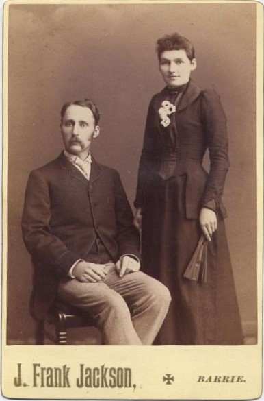 Wedding portrait of Robert T. Webb and Ada "Addie" Young, who were married on 16 September 1890. The photo was taken by J. Frank Jackson in Barrie and shows Robert seated wearing a dark jacket and sporting a moustache, with Addie standing beside him in a long sleeved dark dress holding a closed fan.