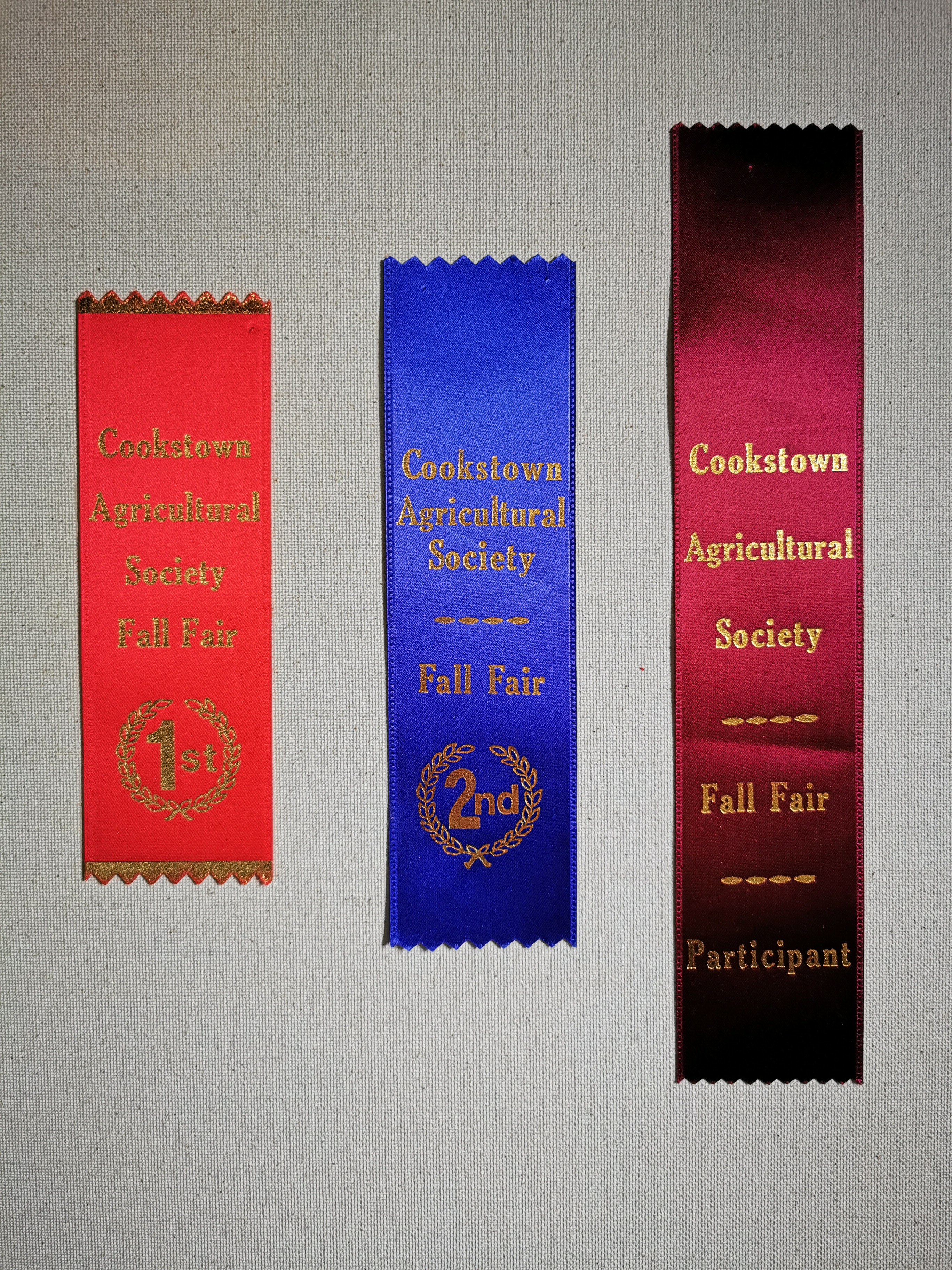 Photo of three ribbons awarded by judges representing the Cookstown Agricultural Society at the annual Fair Fair. The red ribbon on the left would have been awarded to First Place for any of the numerous contests and competitions held at the fair, the middle blue ribbon would have been awarded to Second Place, and the burgundy ribbon on the right was awarded to all participants.