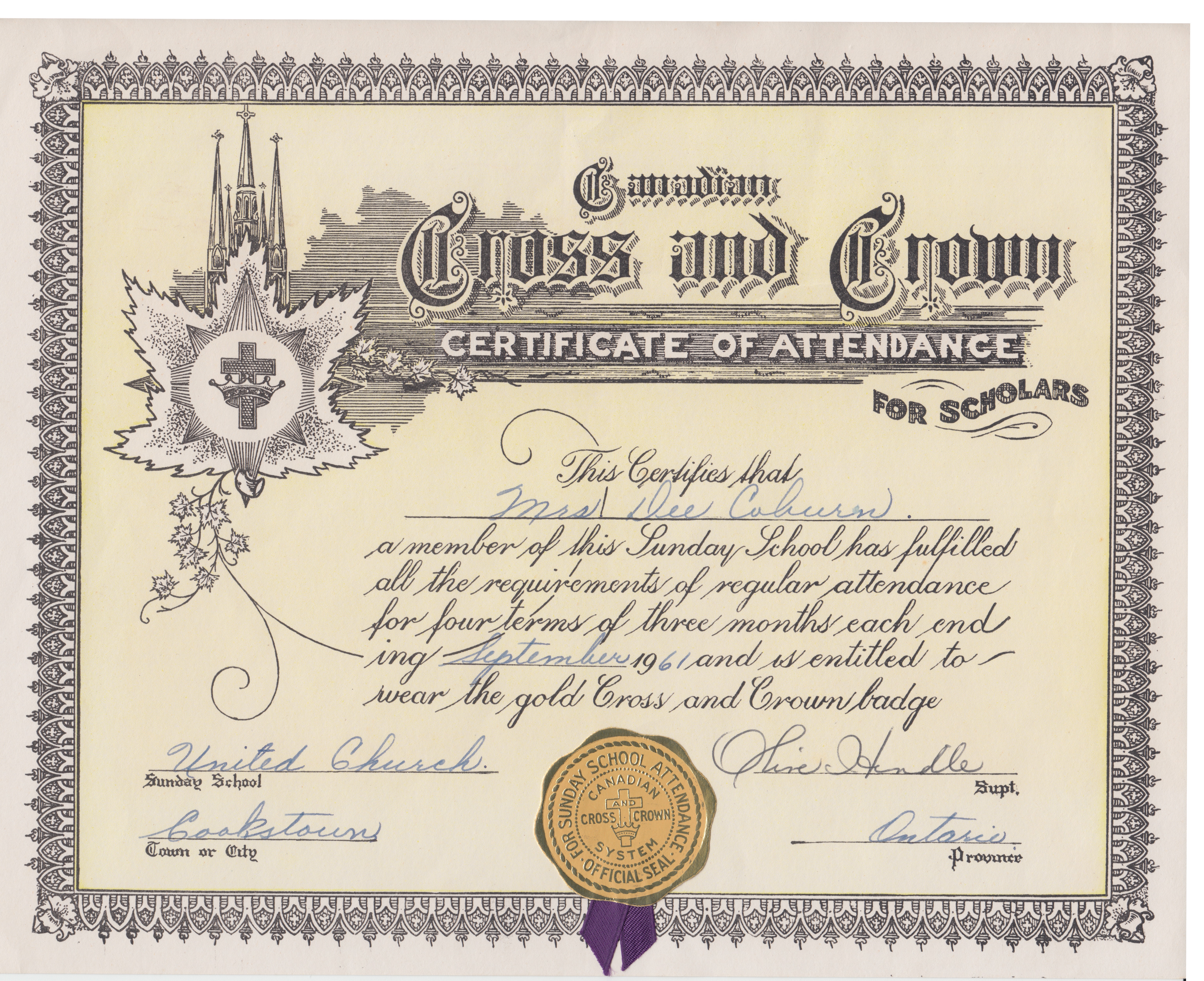 Scan of a certificate of attendance from the Canadian Cross and Crown. The certificate reads: "Canadian Cross and Crown Certificate of Attendance For Scholars. This Certifies that Mrs. Dee Coburn a member of this Sunday School has fulfilled all the requirements of regular attendance for four terms of three months each ending September 1961 and is entitled to wear the gold Cross and Crown badge." The issuing school is listed as United Church; Town or City is listed as Cookstown; Superintendent is listed as Olive Hindle; and Province is noted as Ontario. The certificate also bears the official seal for Sunday School Attendance in the Canadian Cross and Crown system.