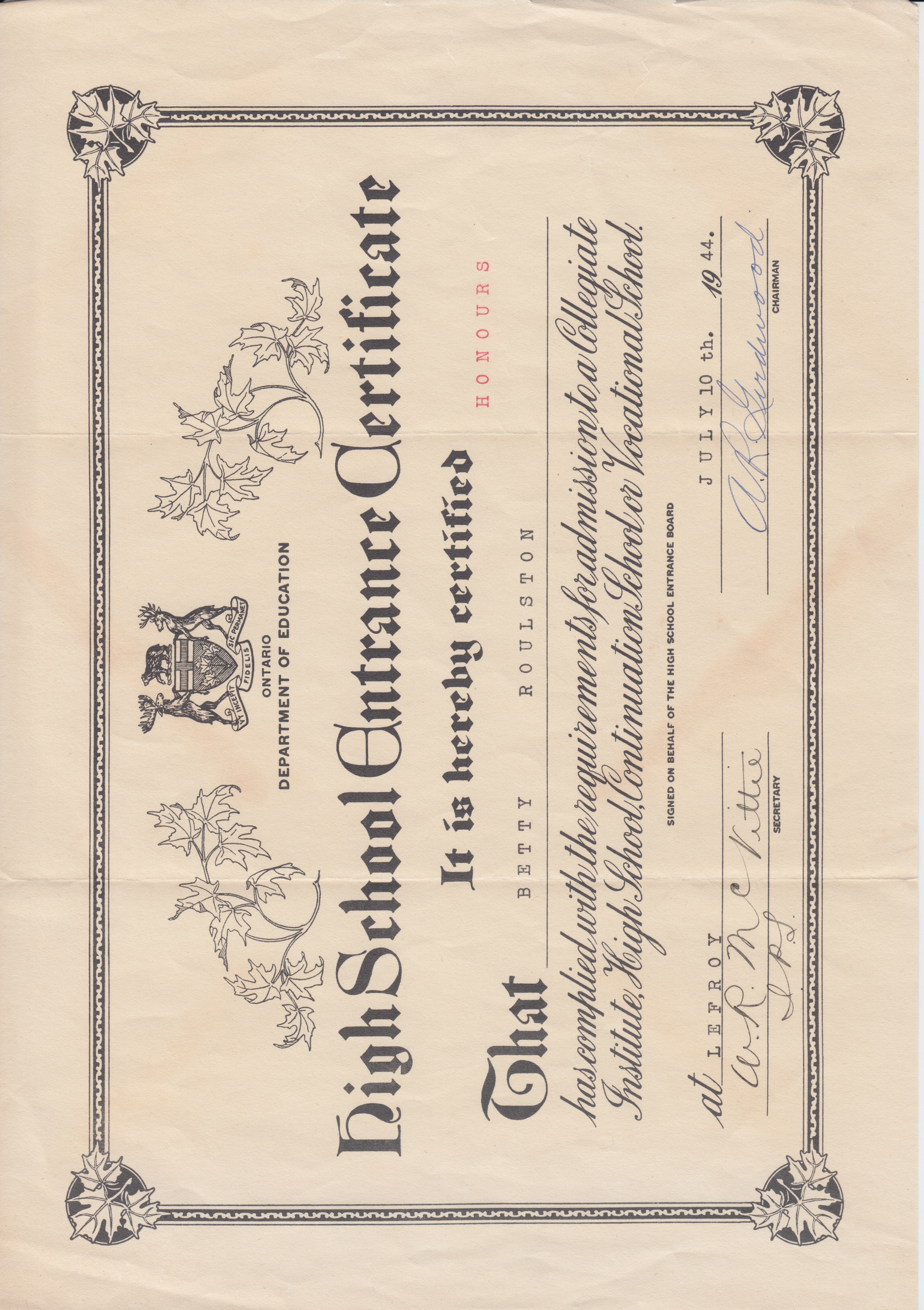 Scan of an Ontario Department of Education High School Entrance Certificate issued to Betty Roulston (later Betty Coburn). The document reads: "It is hereby certified that Betty Roulston has complied with the requirements for admission to a Collegiate Institute, High School, Continuation School or Vocational School. Signed on behalf of the High School Entrance Board at Lefroy." Dated to 10 July 1944 and signed by the Secretary and Chairman.