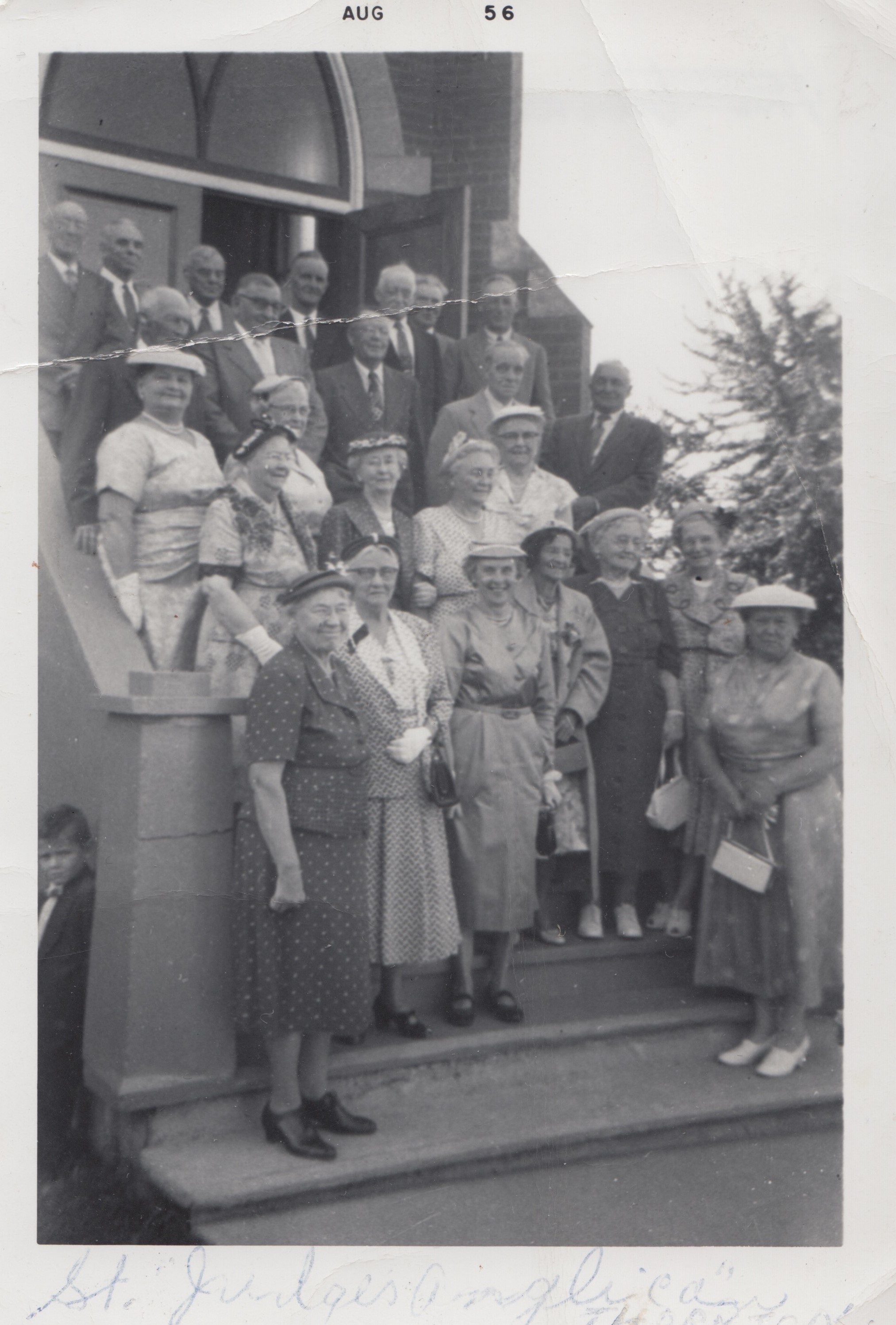 Photo of a large group of people posing on the steps of St. Jude's Anglican Church in Thornton. Standing in the third row from the front on the far left is Ethel May Wice (née Easton) with her mother, Mary Easton, standing just beside and slightly in front of her. The photo was printed in August 1956.