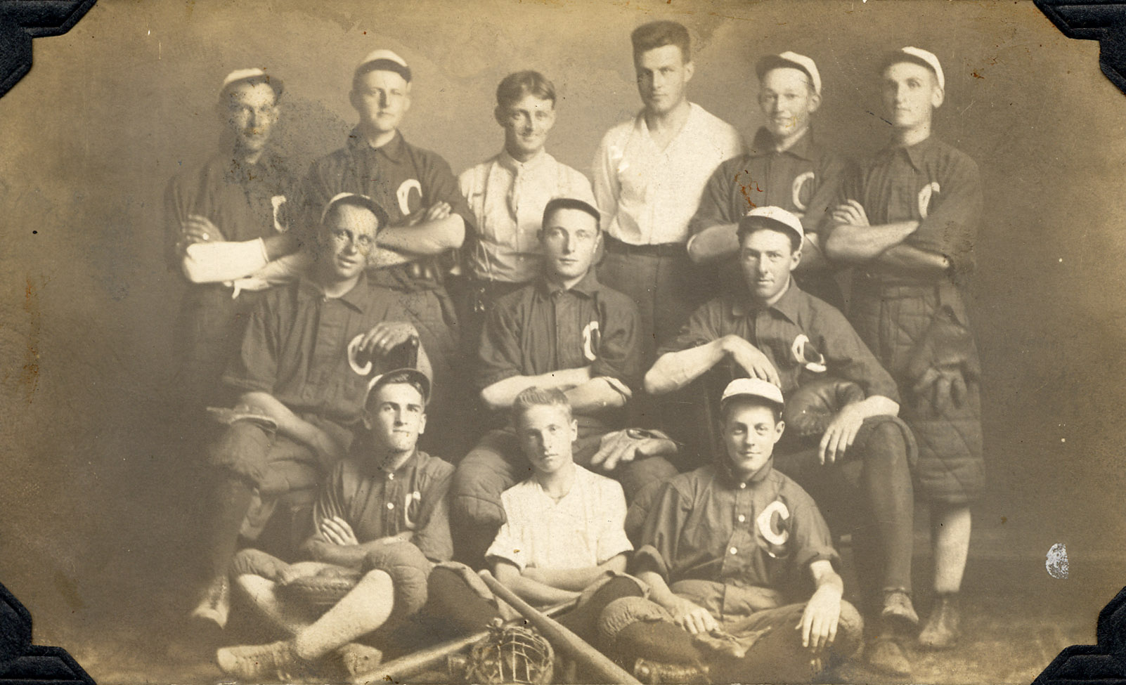 Group photo of the Cookstown Baseball Team as tournament winners for the 1912 Diamond Jubilee. The team members are all dressed in matching white caps and uniform button-up shirts with the letter "C" on the left breast. Pictured from left to right, standing in the back row: Art Thompson, Lew Stewart, Jack Broley, Jack Couse, Art Kidd and Alvin Arnold. Seated in the centre row: Frank Robinson, Norris Hopper, and Lorne Neilly. Seated on the floor, front row: Pat Arnold (Otto), Doug Hopper, and Alpine Couse. Two baseball bats and a catcher's mask are positioned in front of Doug Hopper.