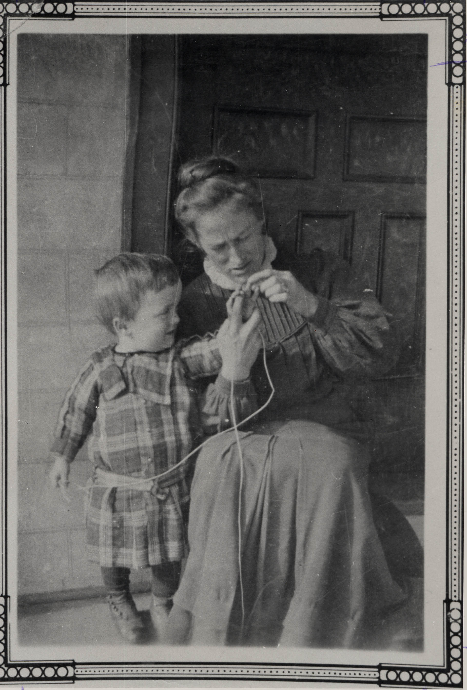 Image suspected to be taken around 1900, of Mrs. Annie Lucas (Née Goodfellow) and Charlie Lucas. Annie was born in 1876 and died in 1968. In the image, Annie is wearing a floor length, long sleeved, high collared dress. Her hair is in an up-do, and she appears to be sat on a stool outside a house. Young Charlie stands next to her in a plaid outfit. The two appear to be playing together and Annie holds one of Charlie's hands. The image includes a decorated border around it.