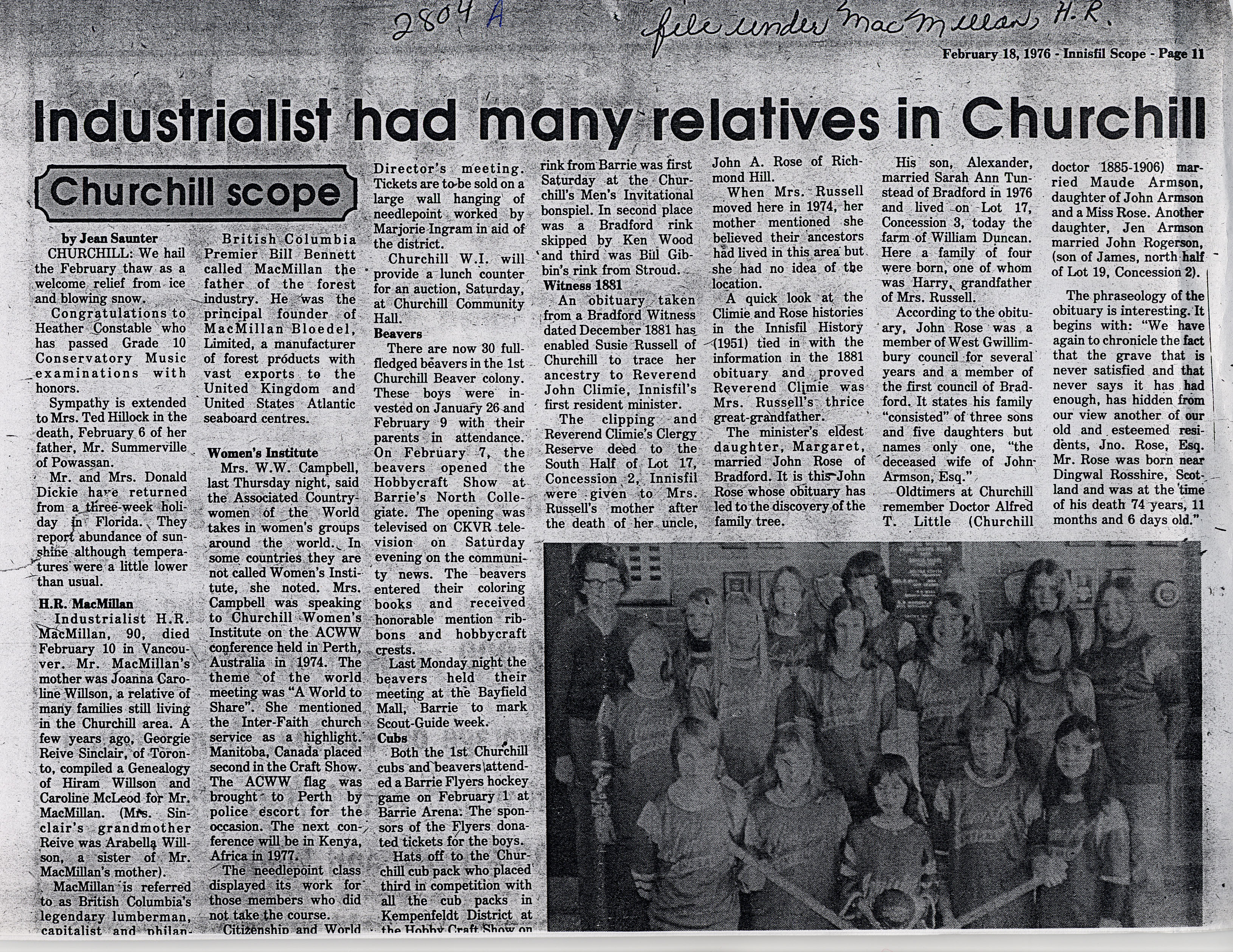 Clipping from Innisfil Scope, "Industrialist had many relatives in Churchill".