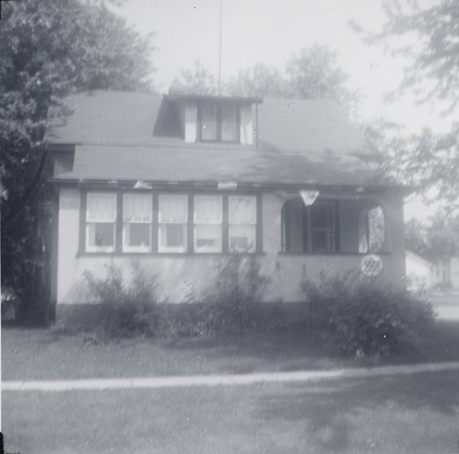 Photo of the exterior of the home of Mr. and Mrs. Wm. Riley. The home has an addition on the front part of the house that adds a large window and a covered, nearly enclosed, porch around the front door. The building is light coloured with dark trim. Some shrubs are growing along the front wall and the photo appears to have been taken in the summer.