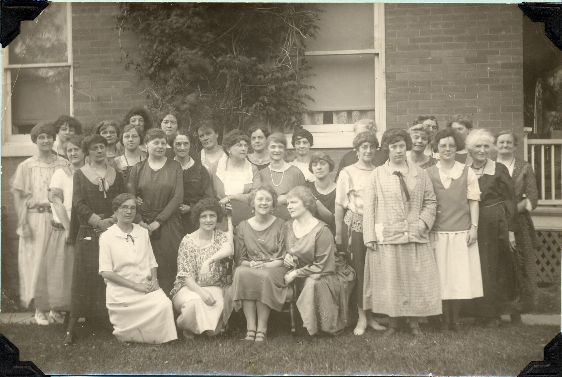 Front Row - Miss Mabel Kell, Mrs. Theodore MacMillan, Mrs. J.R. Couse, Mrs. Hopper, Miss Alzada Neilly, Miss Jarjory Dunning. Second Row - Miss Mabel Chantler, Miss Gerty Cooper, Mrs. R.H. Leadlay, Mrs. Henry Couse, Mrs. R.W. Glass, Mrs. Atton, Mrs. J. Pugsley, Miss Minnie Spence, Mrs. Stoddart, Mrs. Alex Arnold, Mrs. Alex Robinson. Third Row - Miss Lottie Dinwoody, Mrs. W.J. Scott, Mrs. H. Reed, Mrs. H. Dunning, Mrs. McAfee Back Row - Miss Mabel Gollop, Mrs. Jack Parks, Miss Kit Brand, Mrs. T. Gollop