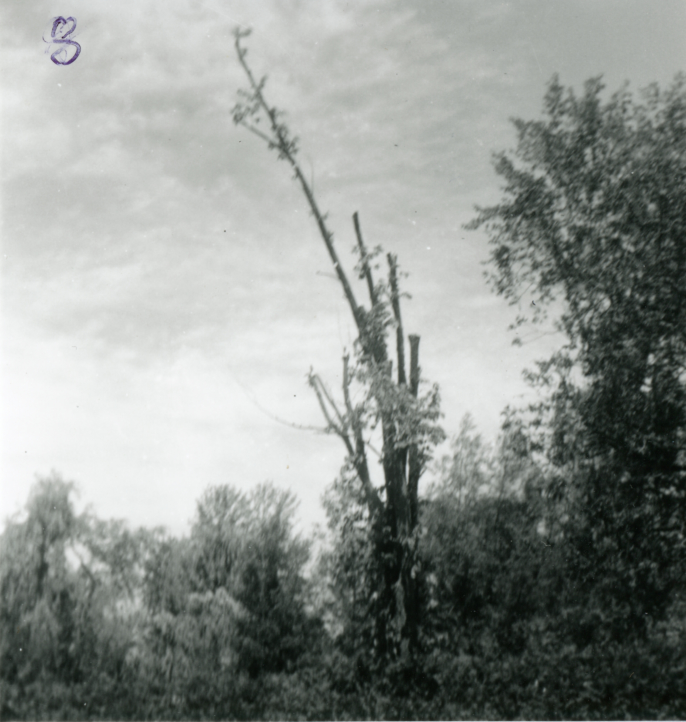 This tree was felled during the storm of July 3, 1957. It was uprooted, and once the family cut the branches it was turned upright again. The storm that could have been a mini tornado struck the area of Belle Ewart. It was mentioned on the radio at the time that the bulk of the storm occurred between 4:00 and 6:00 pm. The ground was saturated from rain the last two weeks of June 1957. Heavy wind did a great deal of damage. In the background of this photo is the Murray Family cottage "Wayne Haven". According to the Murray family, roofs blew off, rowboats were blown into trees, neighbouring cottages of the Grossman Family had all their screens blown out and a garage was blown over. With no phone lines the people of the area lined up at Wark's Store to call fathers and husbands who had returned to work in Toronto. Due to the rain the water level of Lake Simcoe rose so high that it flowed over the break wall, covering lawns and roads.