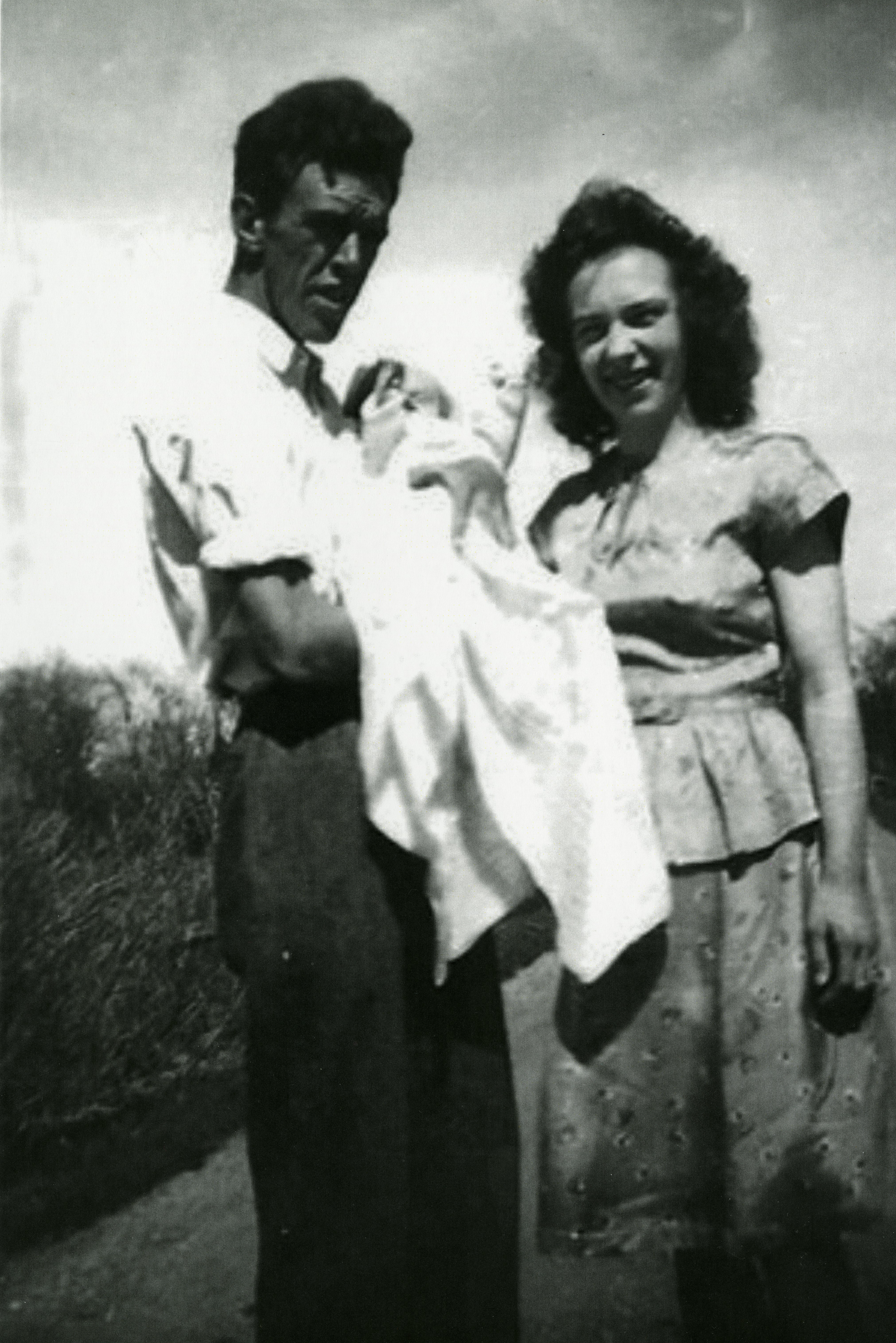 Gordon and Mavis Grainger, with their baby daughter Barbara at Churchill, 1948. Gordon and Mavis lived for a time in a small log cabin on a 100 acre property owned by Gordon's stepfather Ed Crawford and his mother, Annie May (née Brownscombe, Grainger). Baby Barbara appears to be wearing a white christening gown with Gordon holding her.