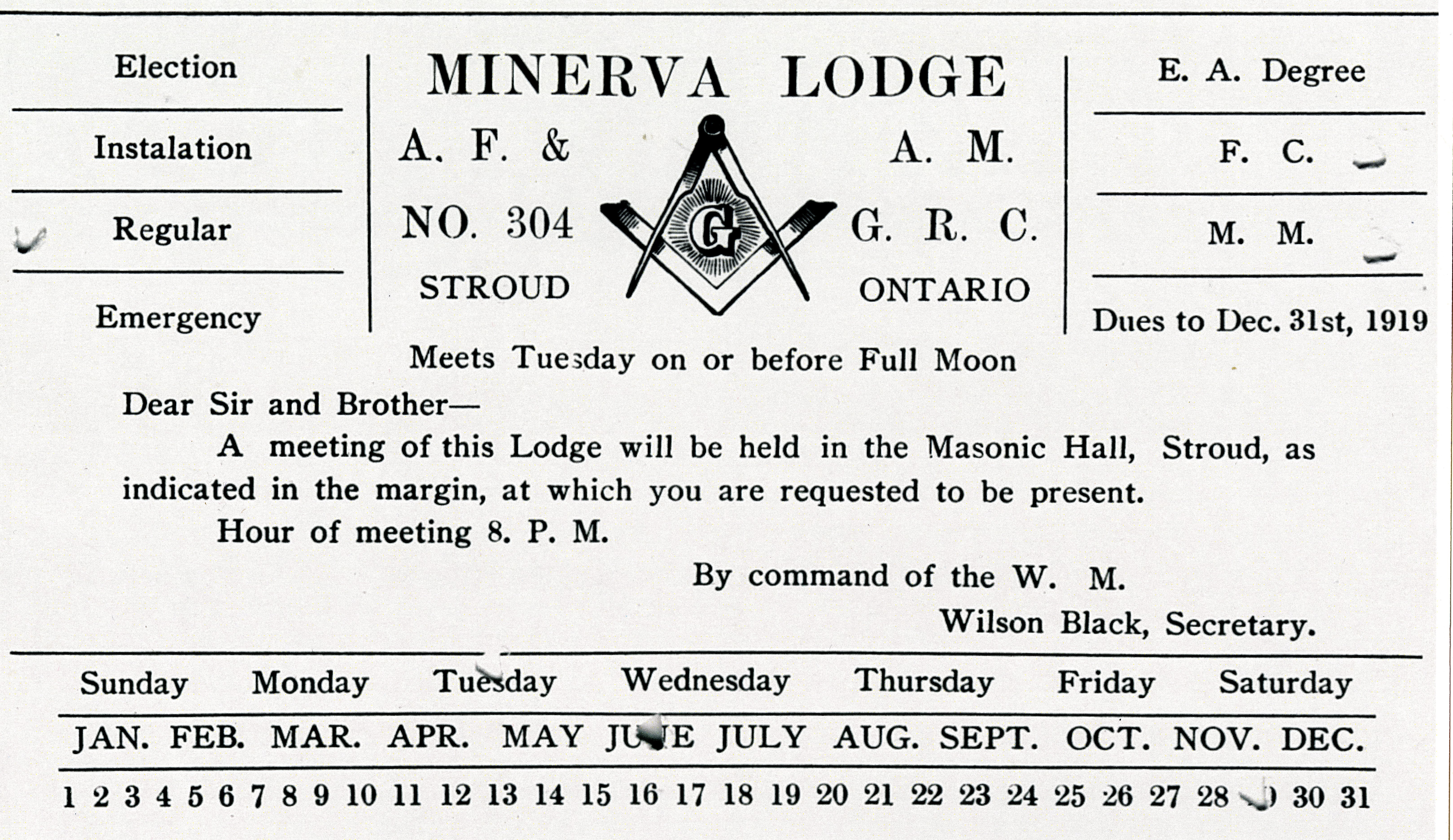 Minerva Lodge #304, Stroud, Reminder Notice of Meeting for Tuesday, June 29, 1919. Text reads Minerva Lodge A.F. and A.M. No. 304 G.R.C. Stroud Ontario Meets Tuesday on or before Full Moon. Dear Sir and Brother - A meeting of this Lodge will be held in the Masonic Hall, Stroud, as indicated in the margin, at which you are requested to be present. Hour of meetin 8. P.M. By command of the W.M. Wilson Black, Secretary. The card is of an interesting design such that it lists the days of the weeks, moths and, numbers 1 through 31 as well as the type of meeting possible. This allowed the secretary to efficiently punch a hole in the desired date to convey the correct information.