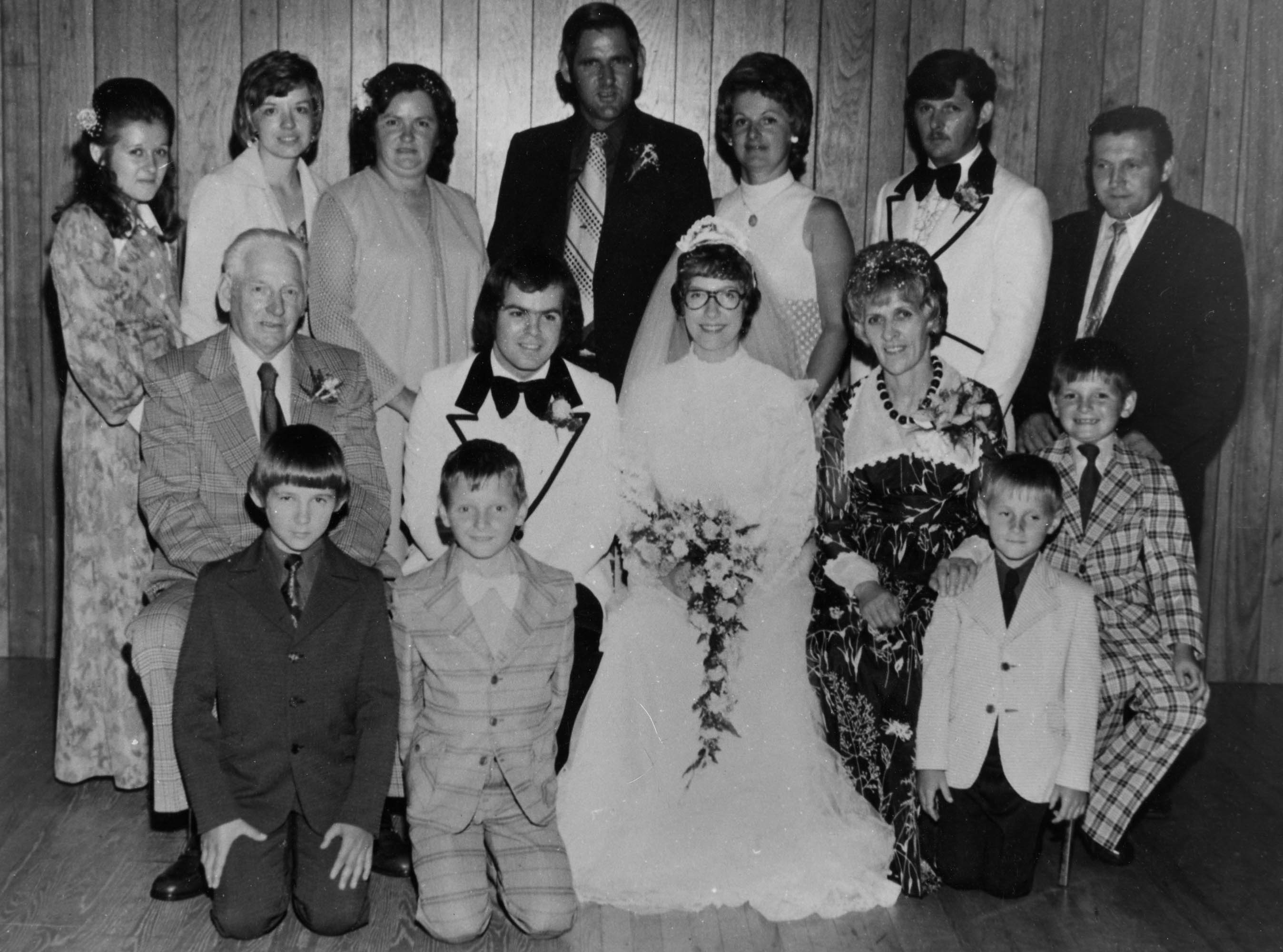 Harold and Kay Matchett and their family when daughter Gail was married. Front, left to right: Fred Zielke Jr., Glenn Zielke, Andrew Zielke Second, Harold Matchett, Ian Anderson and Gail (Matchett) Anderson (the groom and bride), Mrs. Harold Matchett, Brian Zielke Back, Sharon Zielke, Mrs. Edward (Rena) Matchett, Mrs. Fred Zielke (nee Jean Matchett), Kenneth Matchett, Mrs. Kenneth (Joan) Matchett, Edward Matchett, Fred Zielke.
