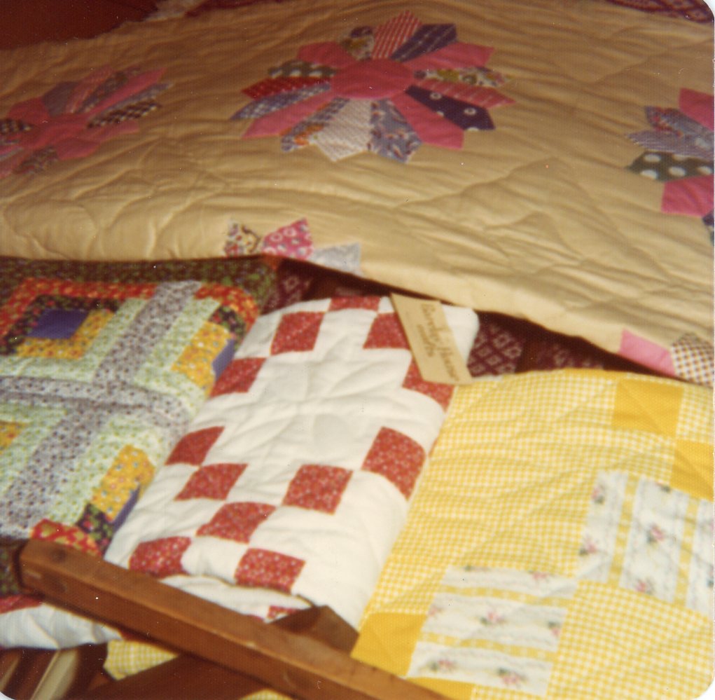 Colour photo of the quilts that were sold in the Barclay House when it functioned as a tea room.