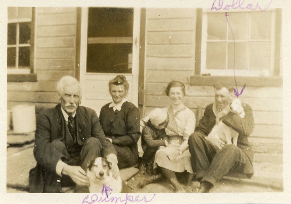 Photo of the Barclay family posing with their dogs on the front stoop of the Barclay home. Pictured from left to right are: John and Maria Louisa Barclay, their grandson Jack Sharpe, daughter Margaret Barclay, and son David "Dee" Barclay. John has hands resting on one dog named Dumper, and the second dog, Dollar, is sitting on Dee's lap.