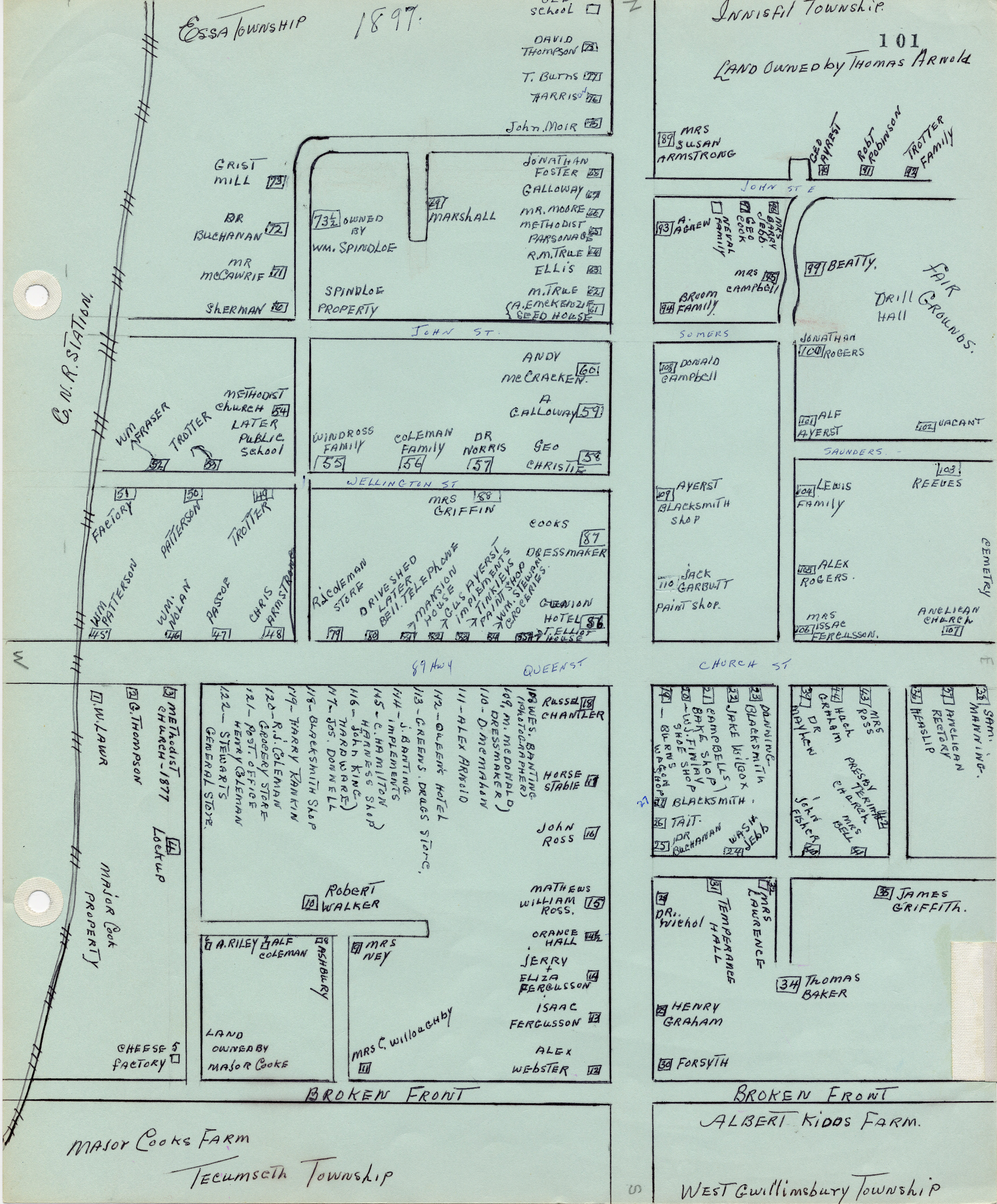 Hand-drawn map of Cookstown from 1897 featuring the location of the households and businesses of the community.