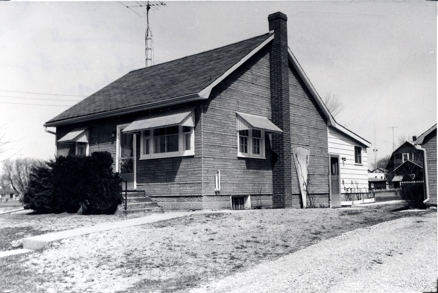 Black and white photo of the exterior of Mr. and Mrs. Harvey and May Kirby's home. It is a small rectangular house with awnings over the two front and one side window, and concrete steps leading to the front door. It has a gable roof and a small extension with white siding has been added on to the rear of the building. The house was originally constructed in 1954 by Ed Webb and Charles Russell, and the Kirby family purchased it in 1968. Harvey Kirby died on 18 January 1985, and May Kirby (née Whiteside) died on 26 August 1992. The house is located on 3 Centre Street, Cookstown.