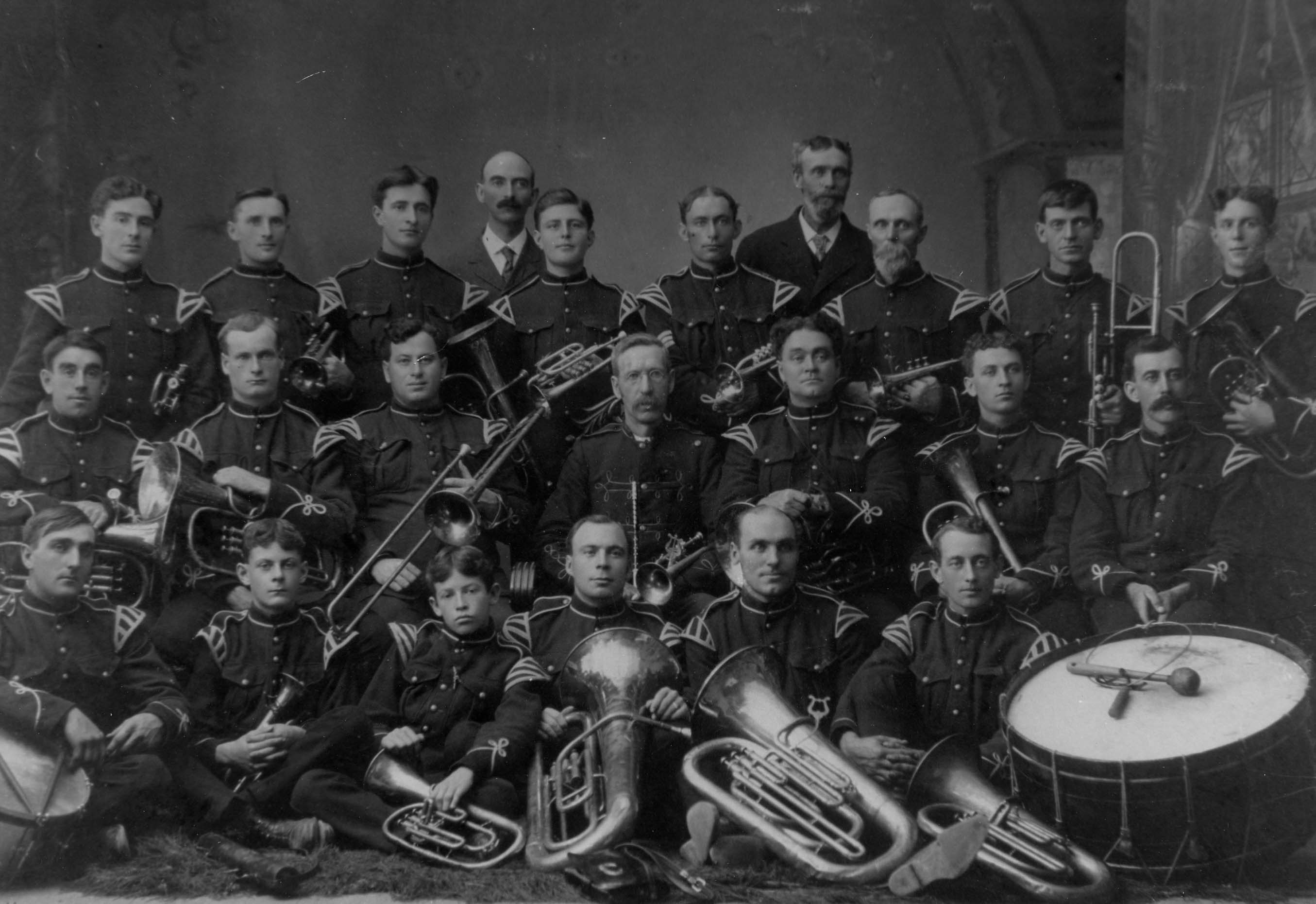 The 35th Regimental Band 1908, Thornton. The Band members can be seen posed for the image, wearing their official uniforms and holding their instruments where possible. Officers: Honorary President (J.A. Corbett not in this picture), Fred Tomlinson, lst Vice President Alex Stewart, 2nd Vice President Bert Ayerst, (not in this picture), Musical Director Robert Lennox, Secretary J.A. Stewart, Treasurer Harcourt Blackstock; Back row left to right: Fred Tomlinson, Alex Stewart. Second row left to right: Fred Nixon, Wilfred T. Hill, Melville H. Corbett, M. Lewis, R. Stewart, Sam J. Maiel, John A. Stewart, J. Frank Ayerst, Jim M. Speers; Third Row left to right: Richard Livingston, Harrison Ayerst, Wesley B.N. Banting, Robert Lennox, William J. Coburn, Harcourt Blackstock, Robert D. Henry; Bottom row left to right: Arthur William Fletcher (cousin to source), T. William Ayerst, Roy Blackstock (only one still living 1977), B. Smith, C. Herbert Fisher, Herbert (Bert) G. Arnold. Music