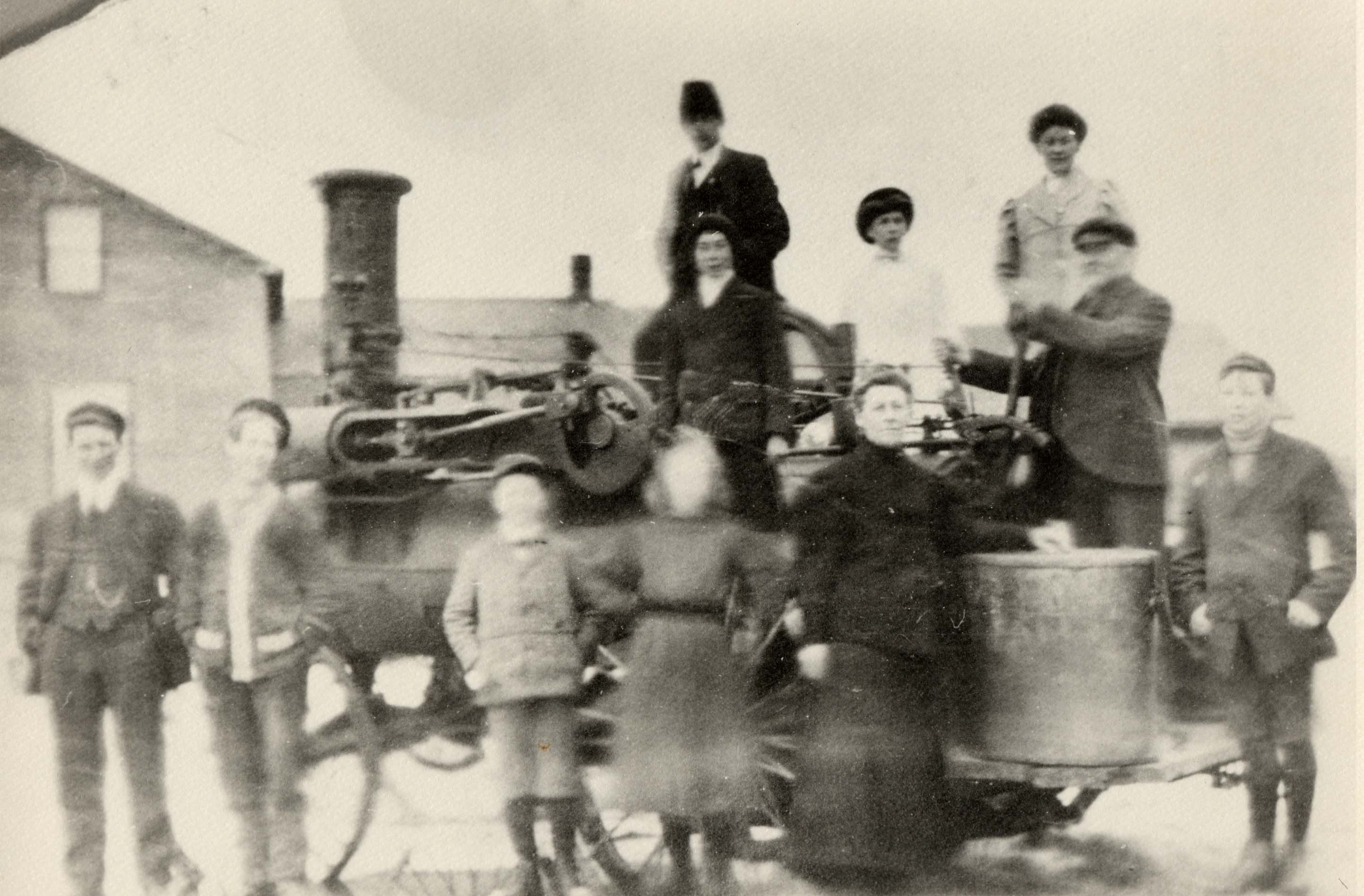 Photo of Mr. and Mrs. George quantz, taken circa 1915, with a group of nine other people gathered around a steam powered tractor. Five are standing on top of the machine, and the rest are standing in front of it. Tractors were an expensive investment and were often loaned to neighbours during the harvest season.