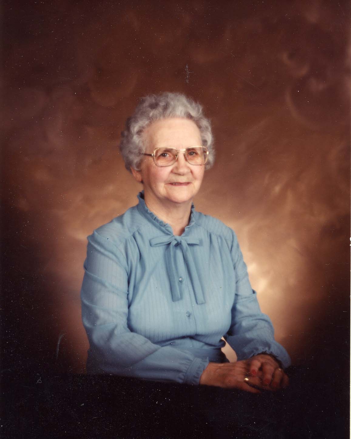 A studio portrait image of Mrs. Alice Baker, taken in 1985. In the image she is wearing a blue high-collared blouse, and eyeglasses. Alice Baker was a Assistant Curator of The Cookstown Women's Institute Tweesdmuir History, Volume III.